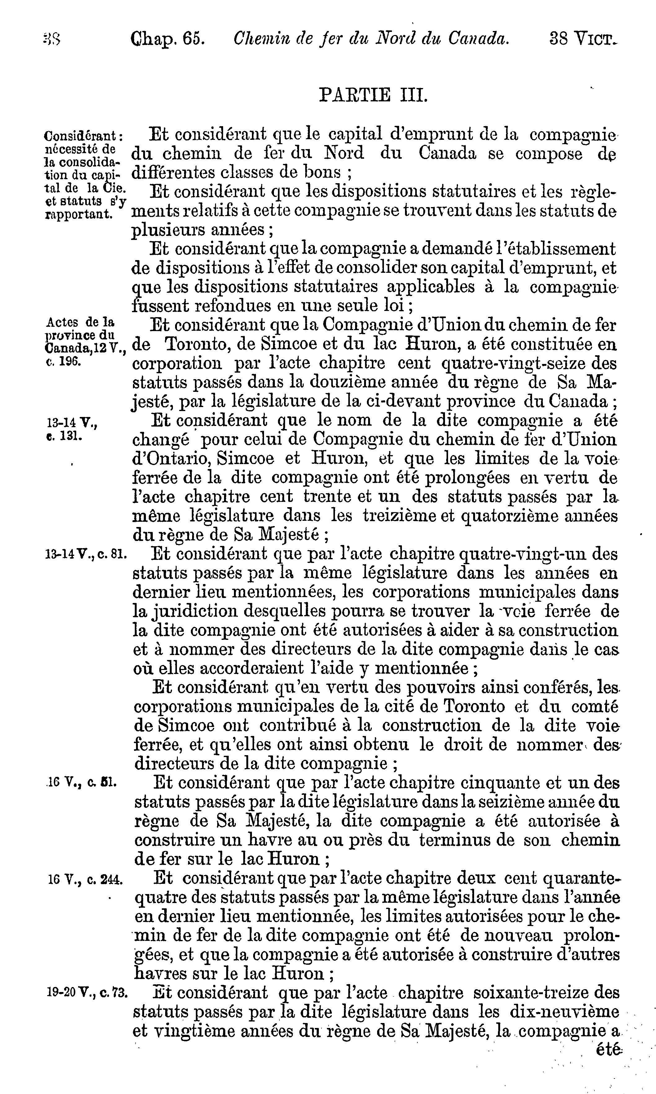 - Actes du parlement de la puissance du Canada passés dans la trente-huitième année du règne de Sa Majesté, la Reine Victoria, et dans la seconde session du troisième parlement : commencée et tenue à Ottawa, le quatrième jour de février, et fermée par prorogation le huitième jour d'avril 1875 : actes privés et locaux : 1875 (ptie 2) (Actes 57-98)