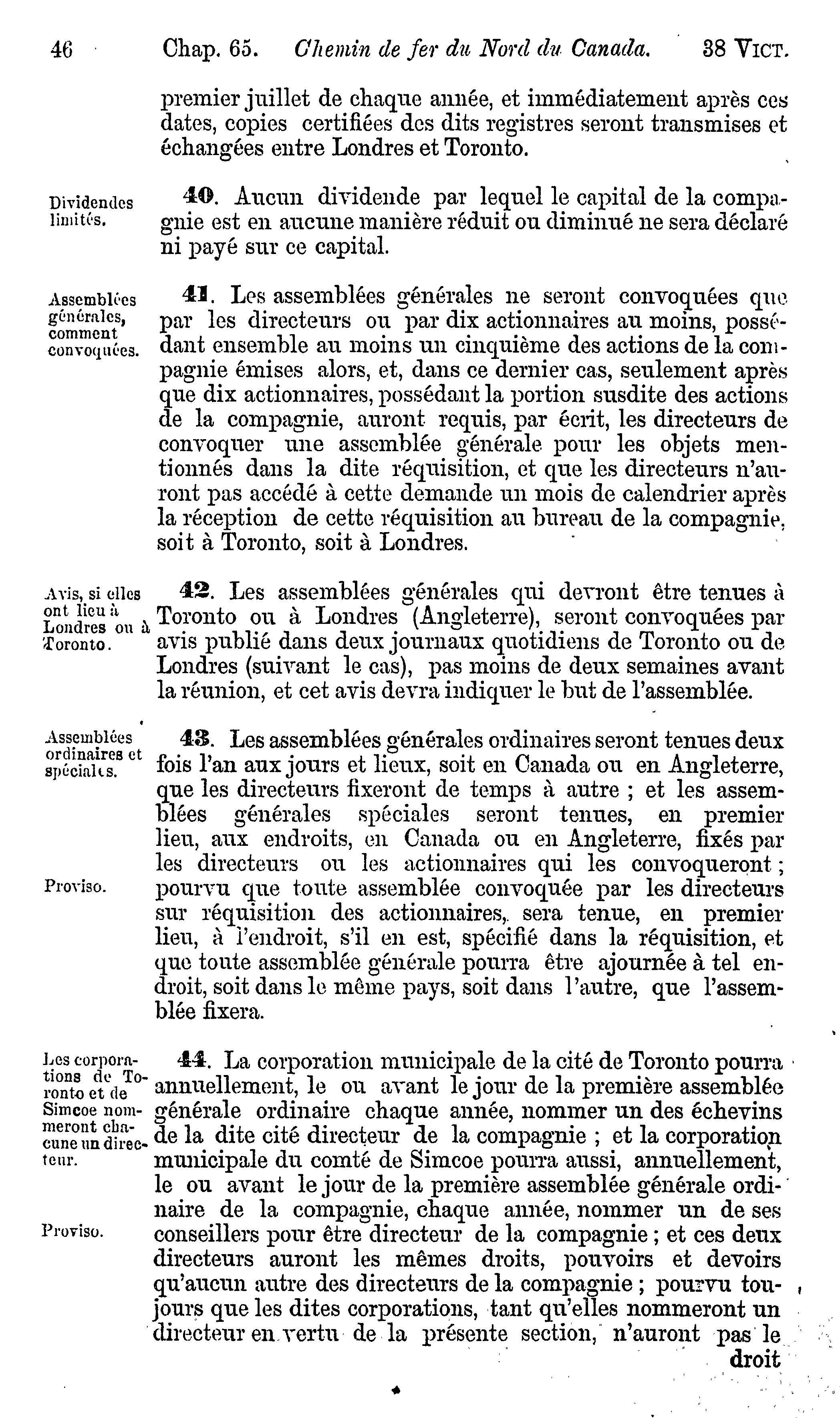 - Actes du parlement de la puissance du Canada passés dans la trente-huitième année du règne de Sa Majesté, la Reine Victoria, et dans la seconde session du troisième parlement : commencée et tenue à Ottawa, le quatrième jour de février, et fermée par prorogation le huitième jour d'avril 1875 : actes privés et locaux : 1875 (ptie 2) (Actes 57-98)