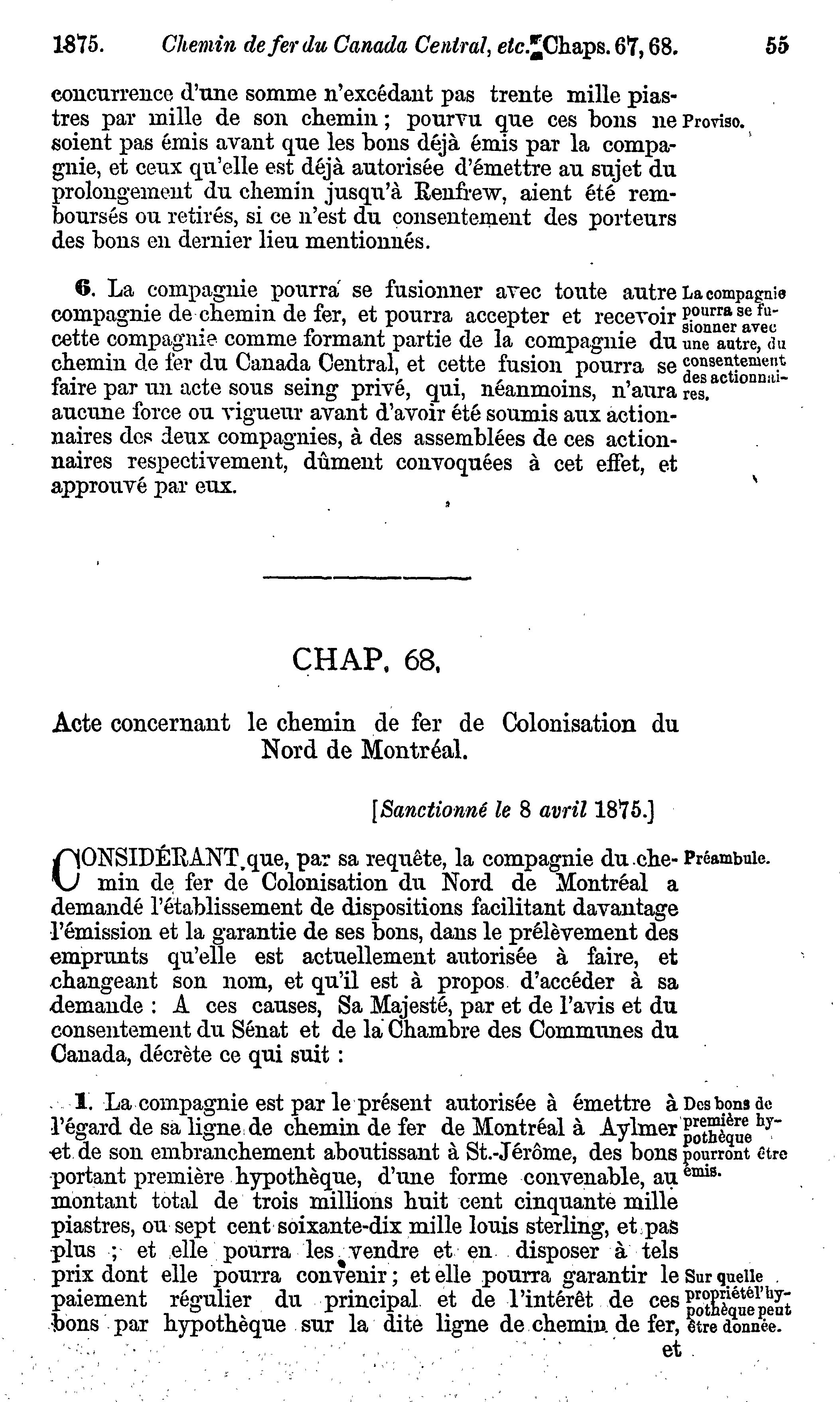 - Actes du parlement de la puissance du Canada passés dans la trente-huitième année du règne de Sa Majesté, la Reine Victoria, et dans la seconde session du troisième parlement : commencée et tenue à Ottawa, le quatrième jour de février, et fermée par prorogation le huitième jour d'avril 1875 : actes privés et locaux : 1875 (ptie 2) (Actes 57-98)