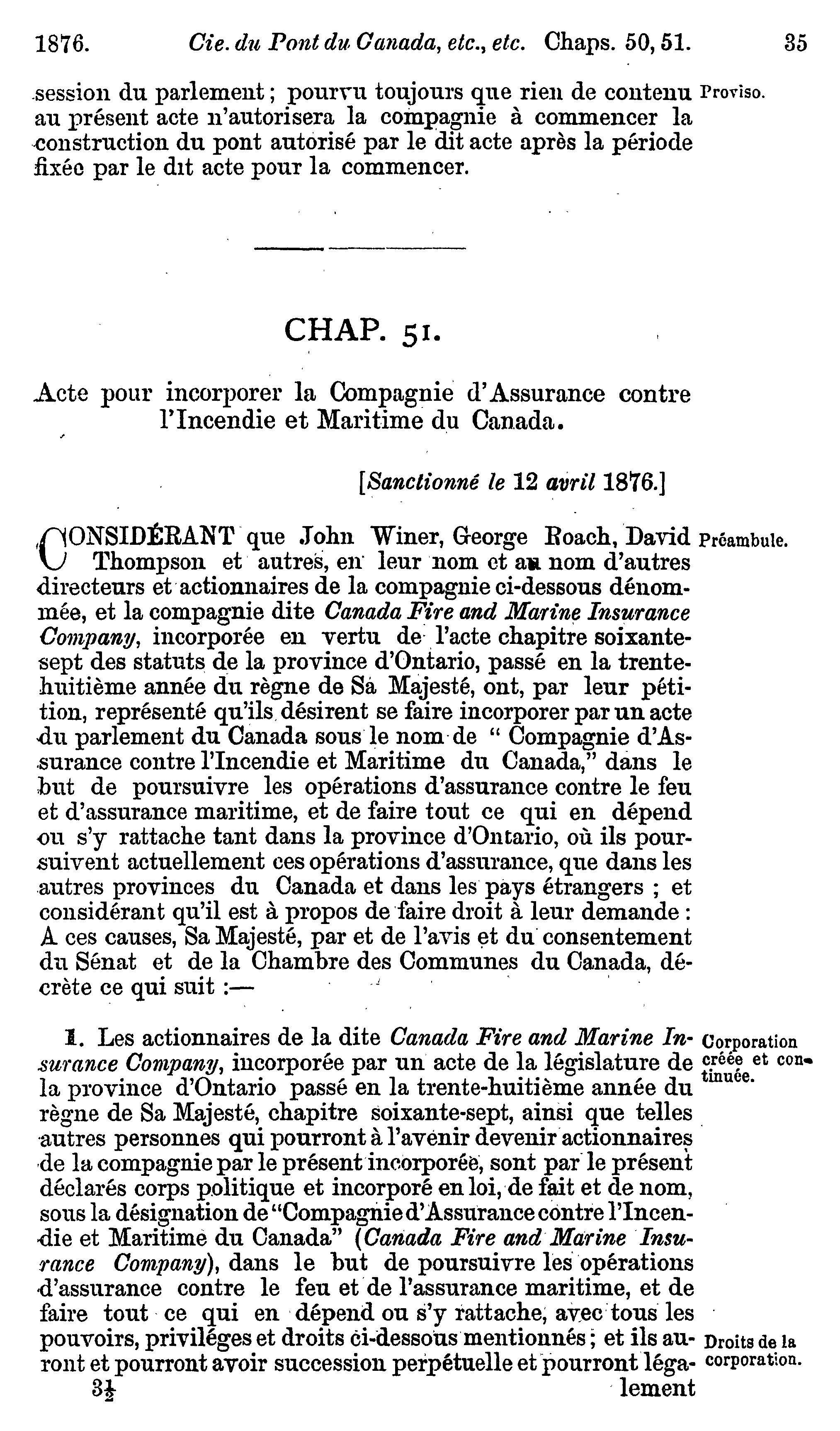 Actes du parlement de la puissance du Canada passés dans la trente-neuvième année du règne de Sa Majesté, la Reine Victoria, et dans la troisième session du troisième parlement : commencée et tenue à Ottawa, le dixième jour de février, et fermée par proclamation le douzième jour d'avril 1876 : actes privés et locaux : 1876 (ptie 2) (Actes 40-75)