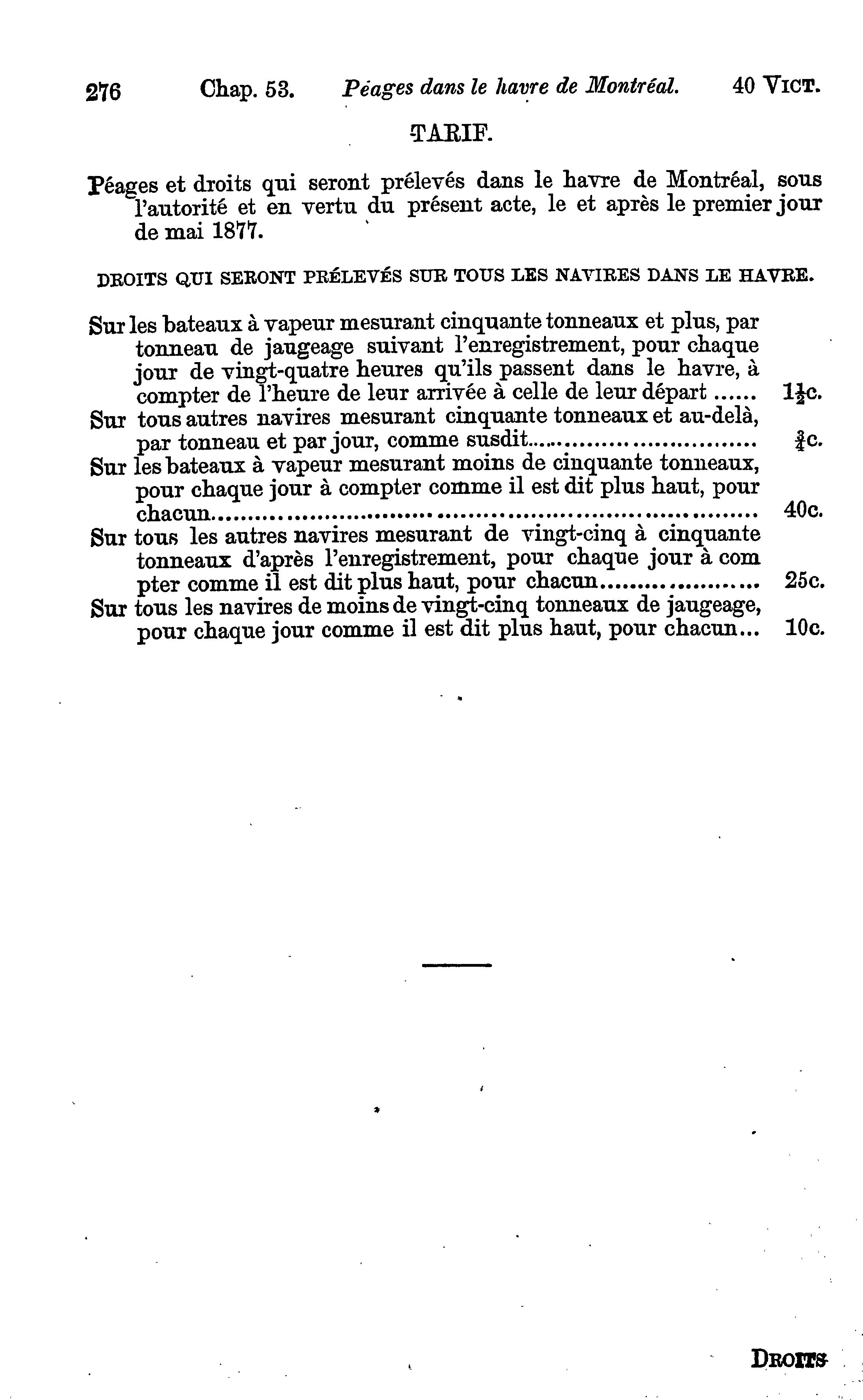 Actes du parlement de la puissance du Canada passés dans la quarantième année du règne de Sa Majesté, la Reine Victoria, et dans la quatrième session du troisième parlement : commencée et tenue à Ottawa, le huitième jour de février, et fermée par prorogation le vingt-huitième jour d'avril 1877 : actes publics généraux : 1877 (ptie 1) (Actes 1-53)