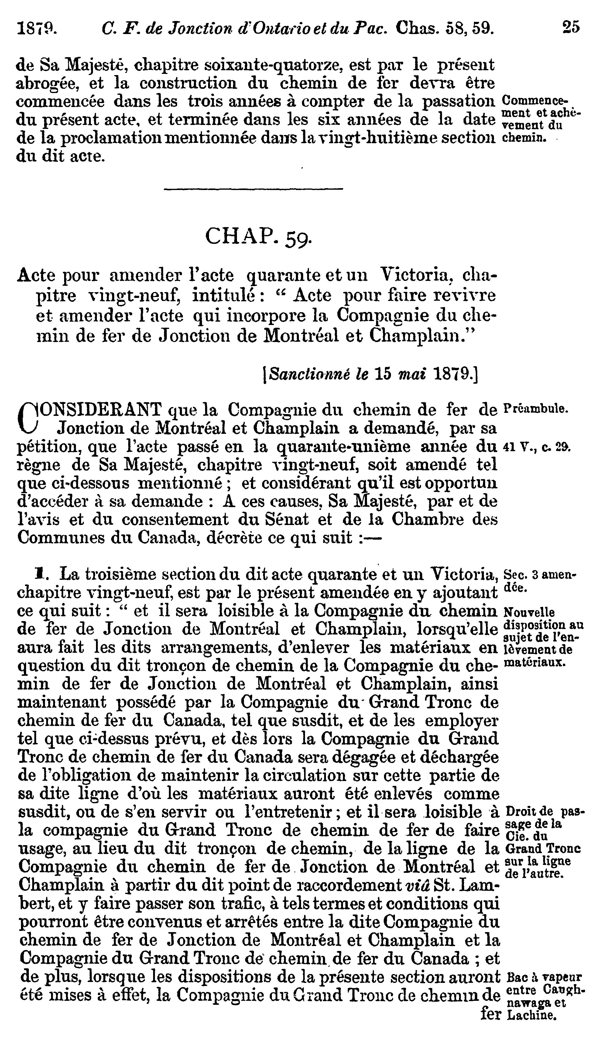- Actes du parlement de la puissance du Canada passés dans la quarante-deuxième année du règne de Sa Majesté, la Reine Victoria, et dans la première session du quatrième parlement : commencée et tenue à Ottawa, le treizième jour de février, et fermée par prorogation le quinzième jour de mai 1879 : actes privés et locaux : 1879 (ptie 2) (Actes 52-79)