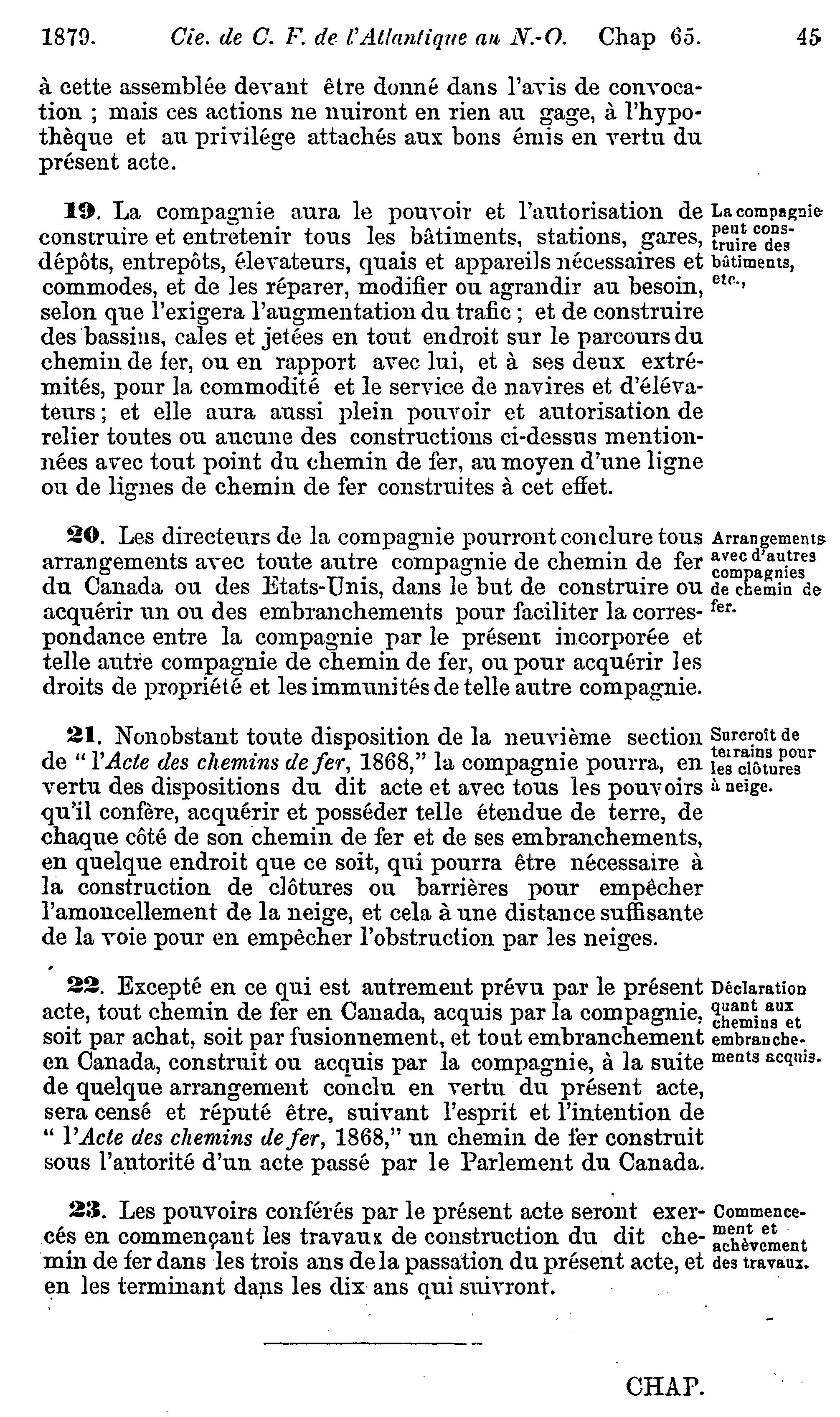 - Actes du parlement de la puissance du Canada passés dans la quarante-deuxième année du règne de Sa Majesté, la Reine Victoria, et dans la première session du quatrième parlement : commencée et tenue à Ottawa, le treizième jour de février, et fermée par prorogation le quinzième jour de mai 1879 : actes privés et locaux : 1879 (ptie 2) (Actes 52-79)