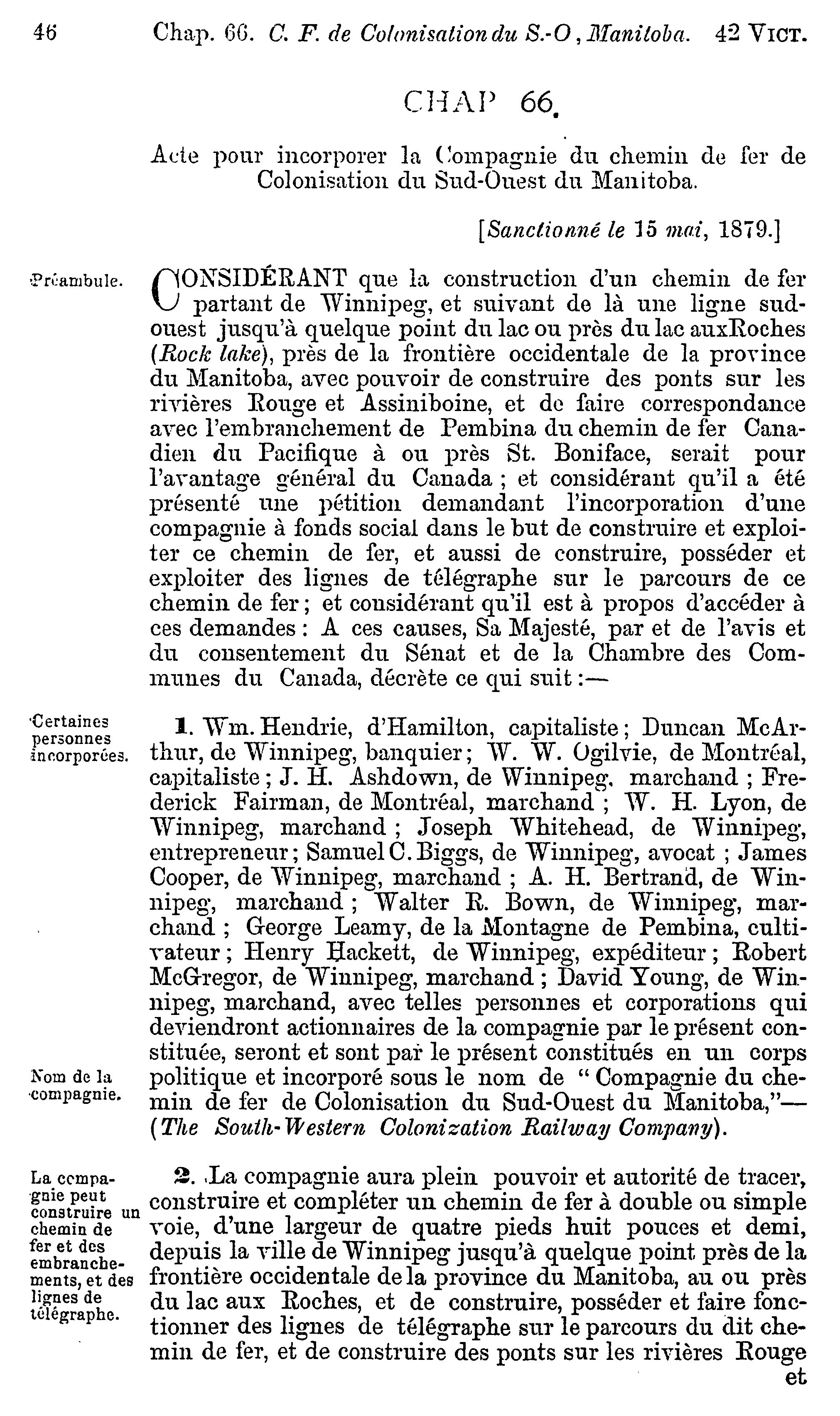 Actes du parlement de la puissance du Canada passés dans la quarante-deuxième année du règne de Sa Majesté, la Reine Victoria, et dans la première session du quatrième parlement : commencée et tenue à Ottawa, le treizième jour de février, et fermée par prorogation le quinzième jour de mai 1879 : actes privés et locaux : 1879 (ptie 2) (Actes 52-79)