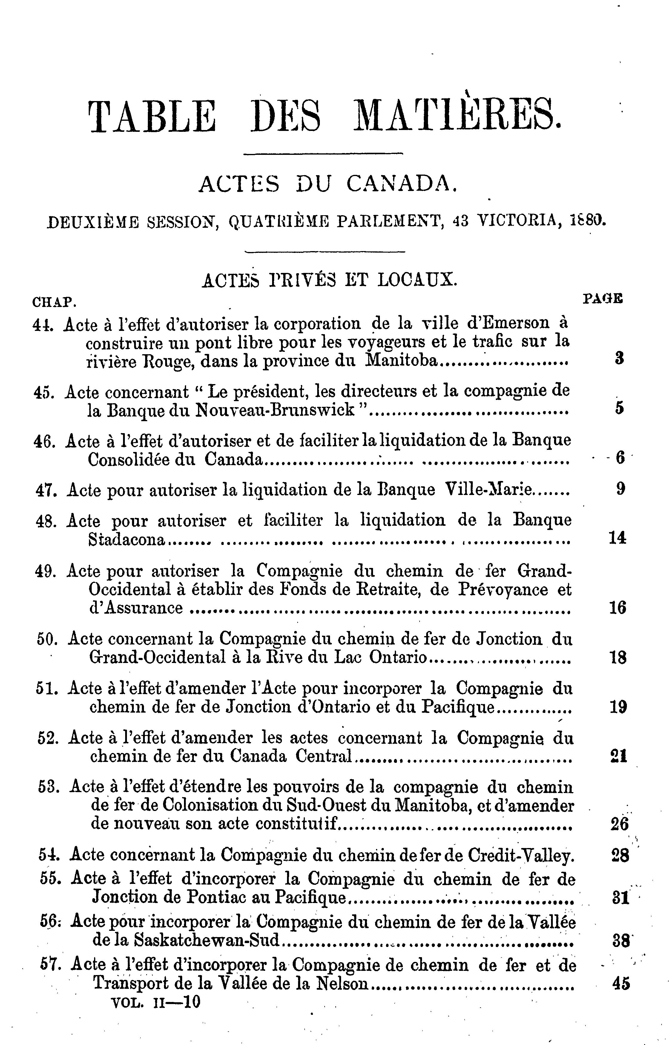 - Actes du parlement de la puissance du Canada passés dans la quarante-troisième année du règne de Sa Majesté, la Reine Victoria, et dans la deuxième session du quatrième parlement : commencée et tenue à Ottawa, le douzième jour de février, et fermée par prorogation le septième jour de mai 1880 : actes locaux et privés : 1880 (ptie 2) (Actes 44-76)