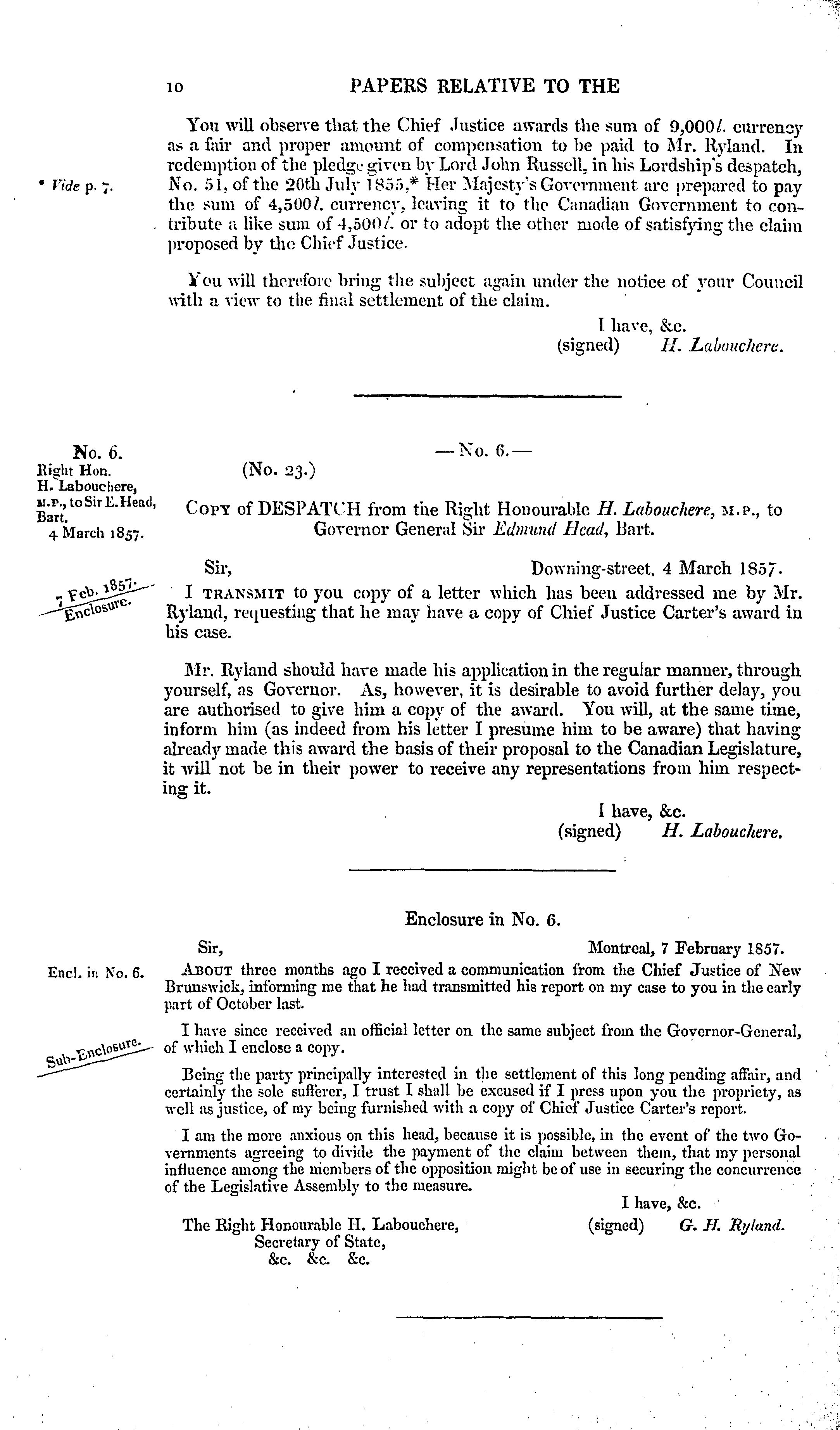 Mr. G.H. Ryland : copy of papers and correspondence, &c. between the Imperial government and Government of Canada, from 1 June 1855, relative to the case of Mr. George H. Ryland, formerly Clerk of the council in Canada, including Lord John Russell's despatch of 20 July 1855, &c