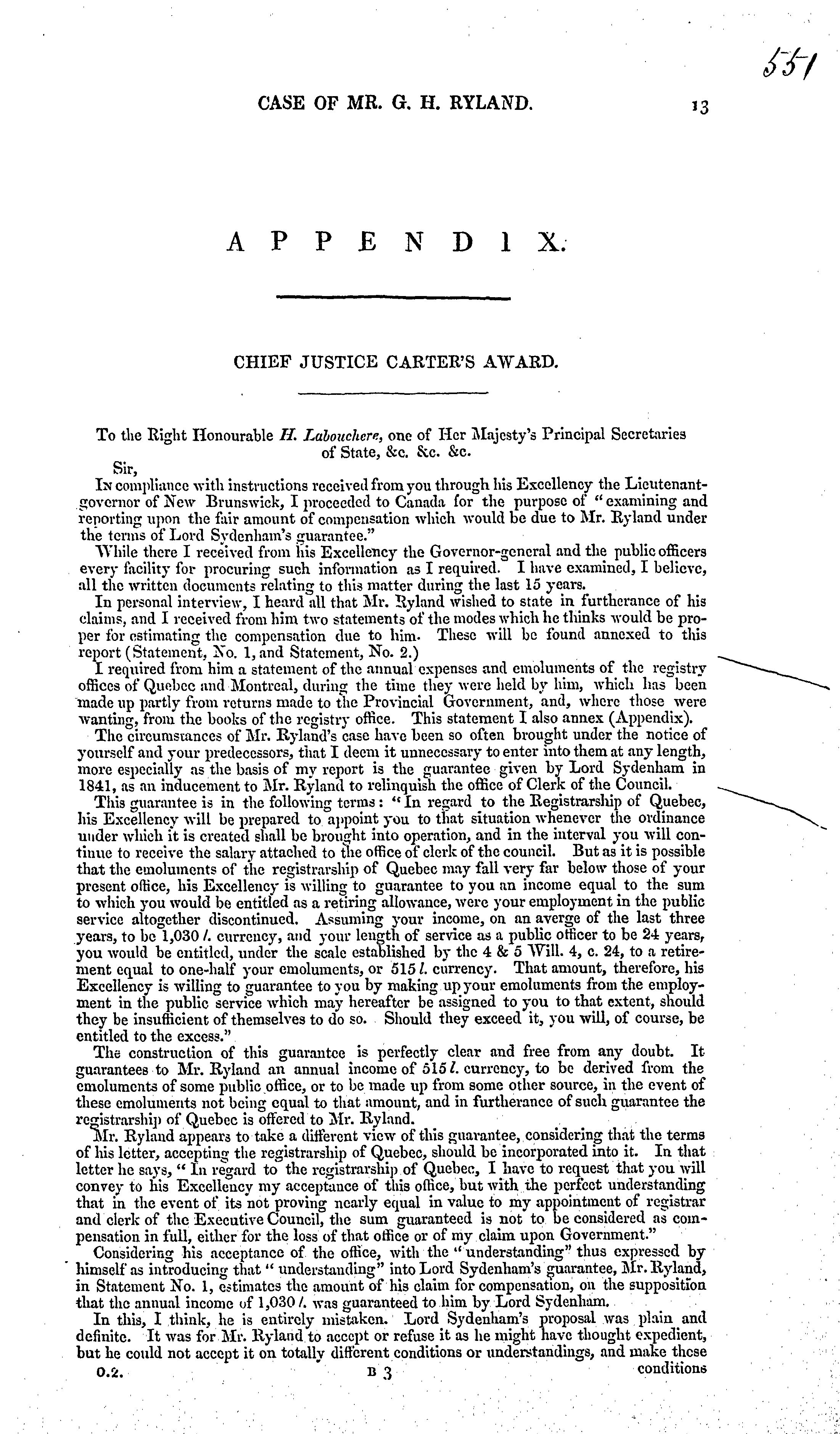 Mr. G.H. Ryland : return to an address of the Honourable the House of Commons, dated 13 July 1858, for, a "Copy of all papers and correspondence, or extracts of correspondence, between the Imperial government and Government of Canada, from the 1st day of June 1855, relative to the case of Mr. George H. Ryland, formerly Clerk of the Council in Canada, including Lord John Russell's despatch of the 20th July 1855, together with instructions issued to Chief Justice Carter to examine and report on the case, and his report thereon, with accompanying papers". - Published