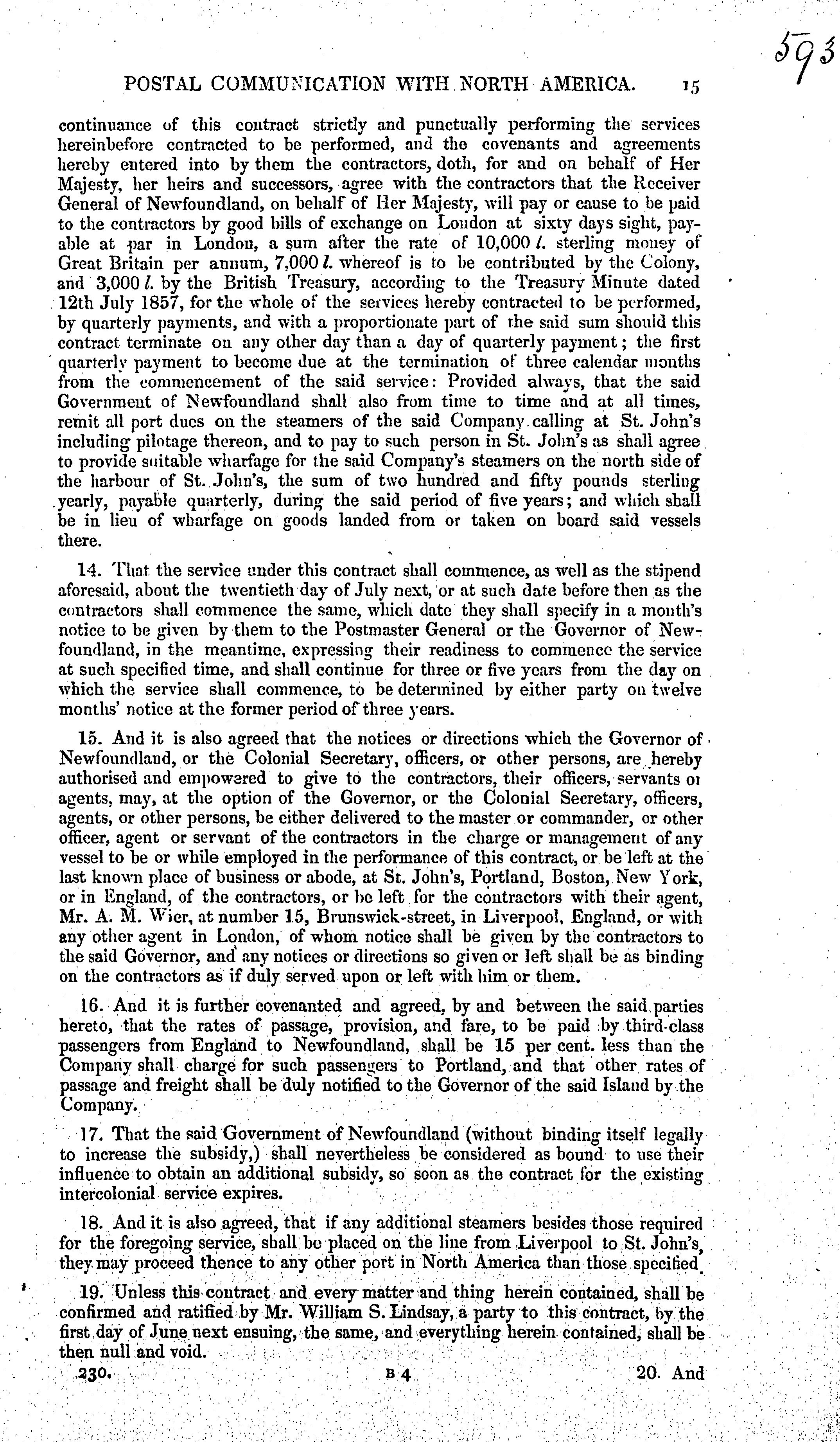 Cover title: Postal communication with North America, mail service (Galway and America) : copies of all applications, reports, papers, and communications made to the government relating to proposals for new contracts to establish steam communication ...