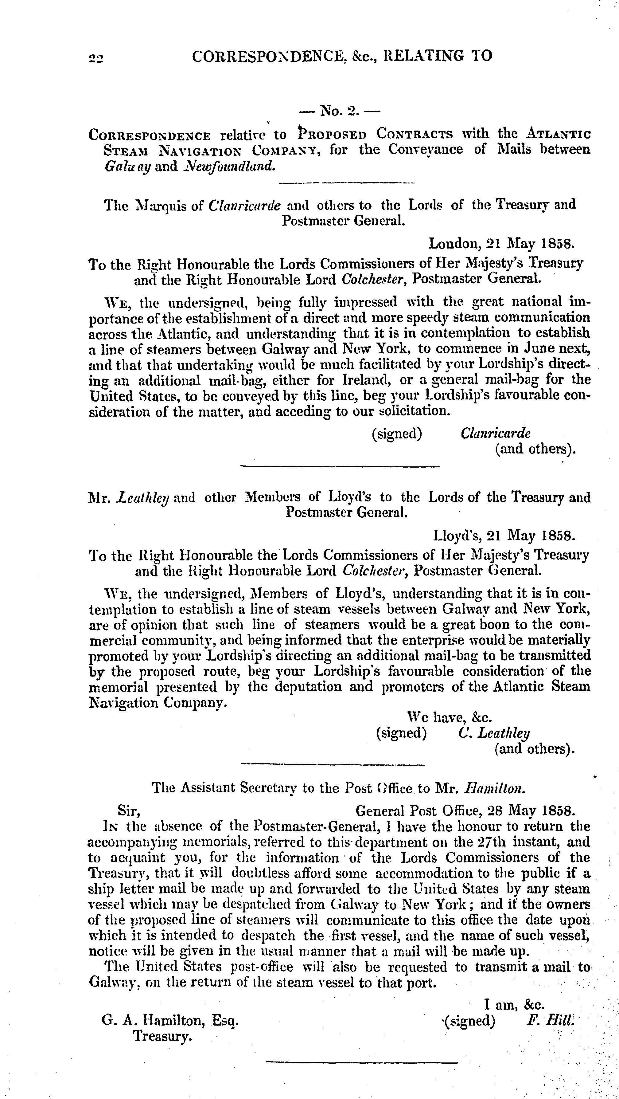 Cover title: Postal communication with North America, mail service (Galway and America) : copies of all applications, reports, papers, and communications made to the government relating to proposals for new contracts to establish steam communication ...