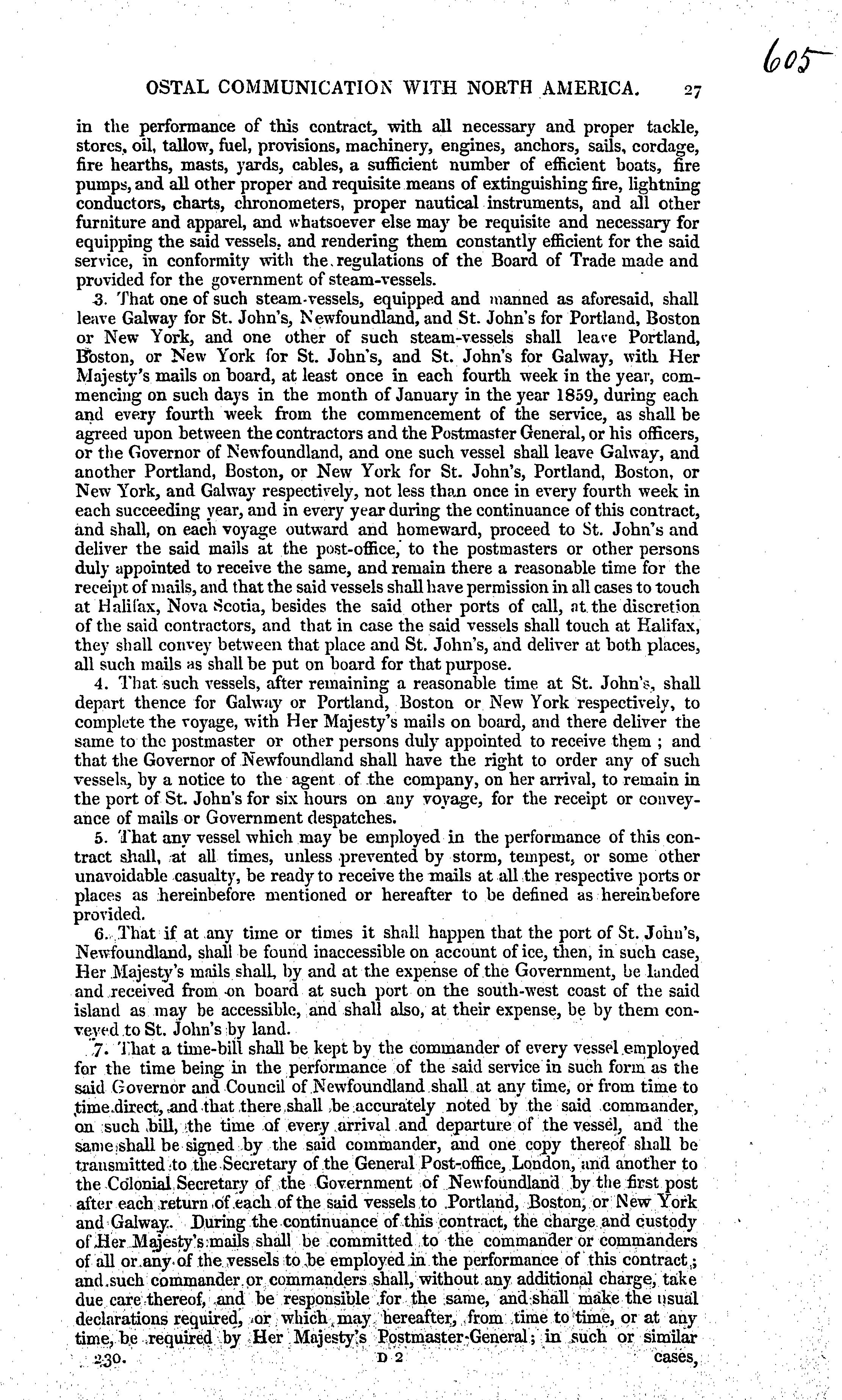 Cover title: Postal communication with North America, mail service (Galway and America) : copies of all applications, reports, papers, and communications made to the government relating to proposals for new contracts to establish steam communication ...