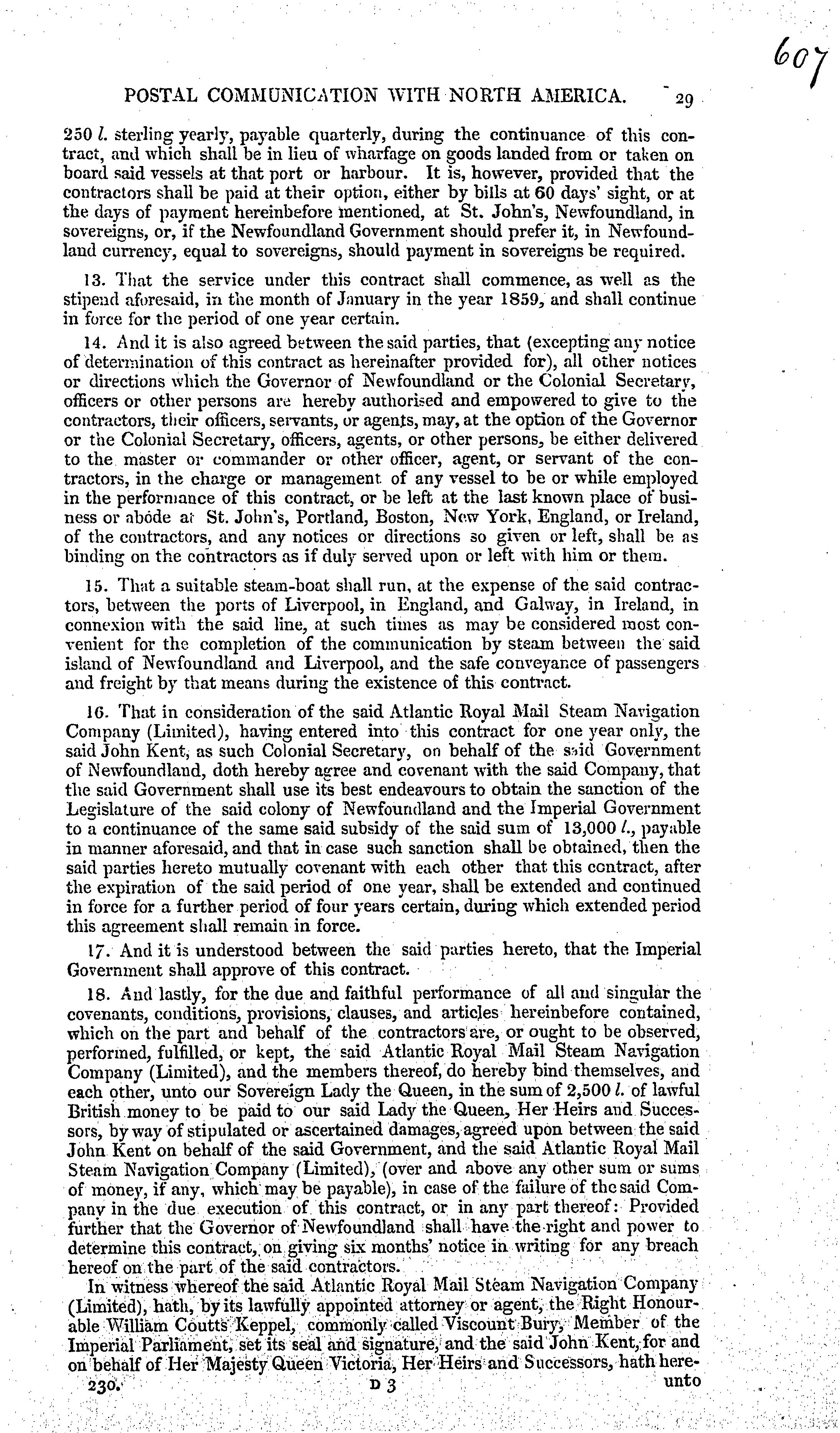 Cover title: Postal communication with North America, mail service (Galway and America) : copies of all applications, reports, papers, and communications made to the government relating to proposals for new contracts to establish steam communication ...