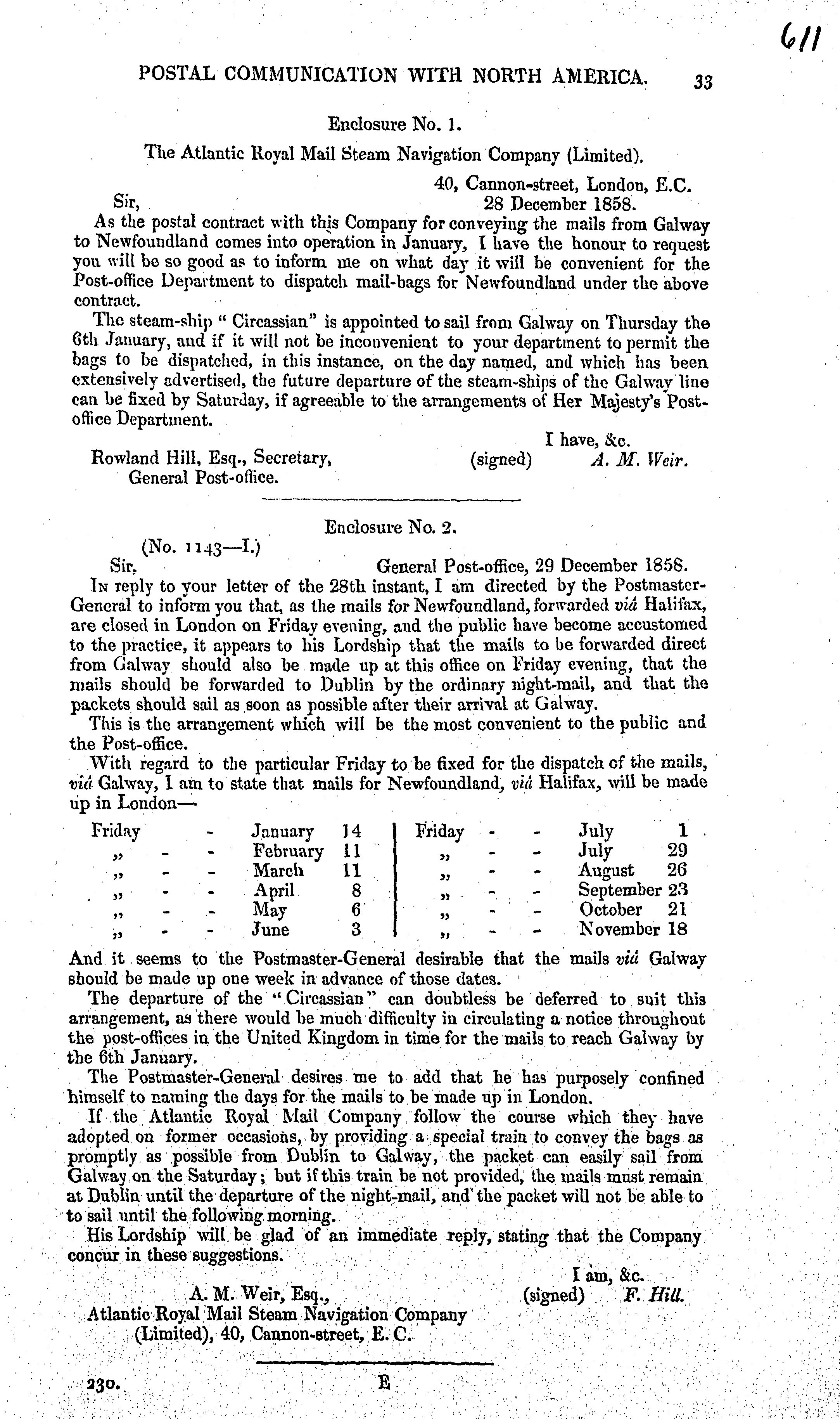 Cover title: Postal communication with North America, mail service (Galway and America) : copies of all applications, reports, papers, and communications made to the government relating to proposals for new contracts to establish steam communication ...