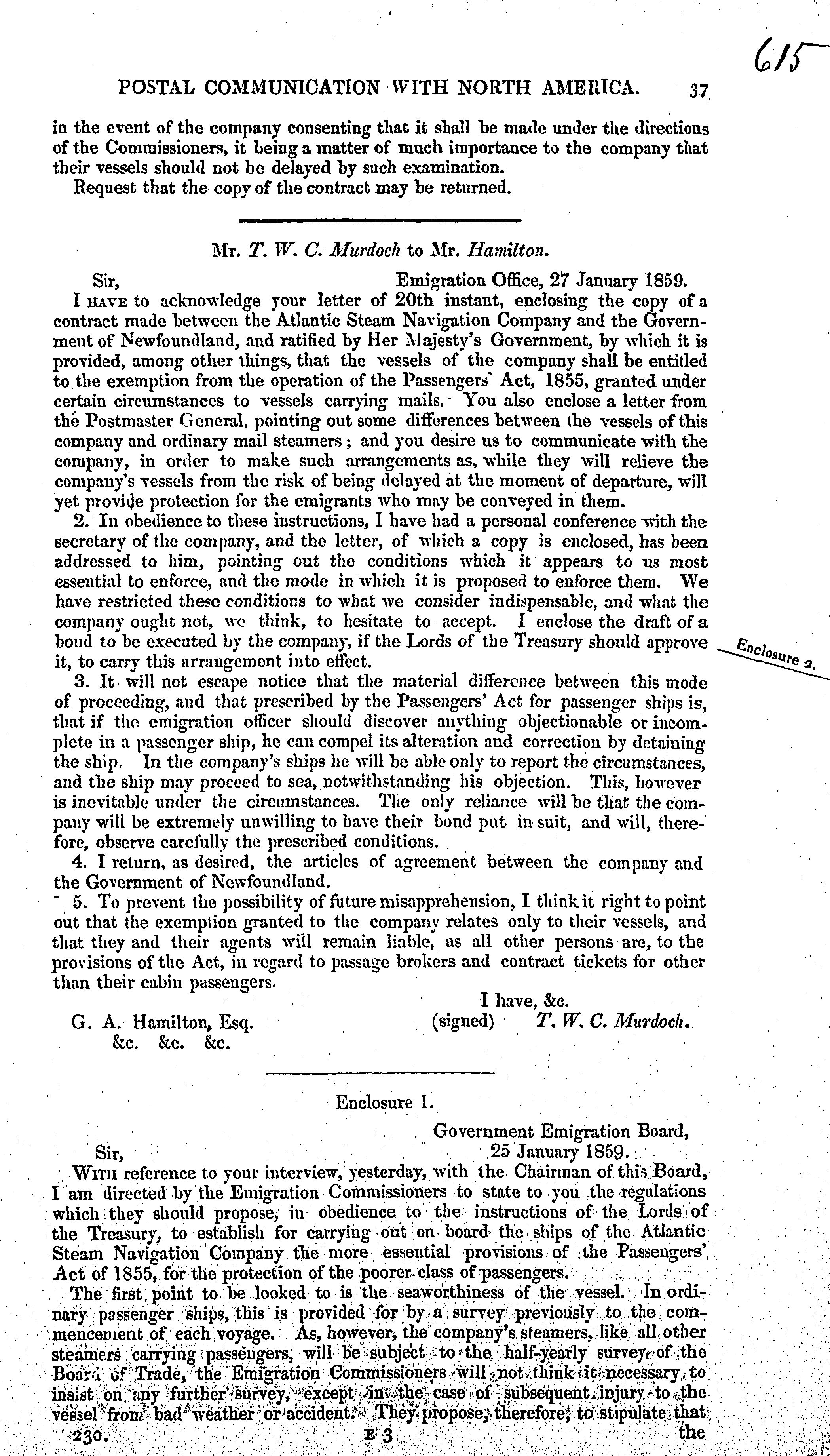 Cover title: Postal communication with North America, mail service (Galway and America) : copies of all applications, reports, papers, and communications made to the government relating to proposals for new contracts to establish steam communication ...