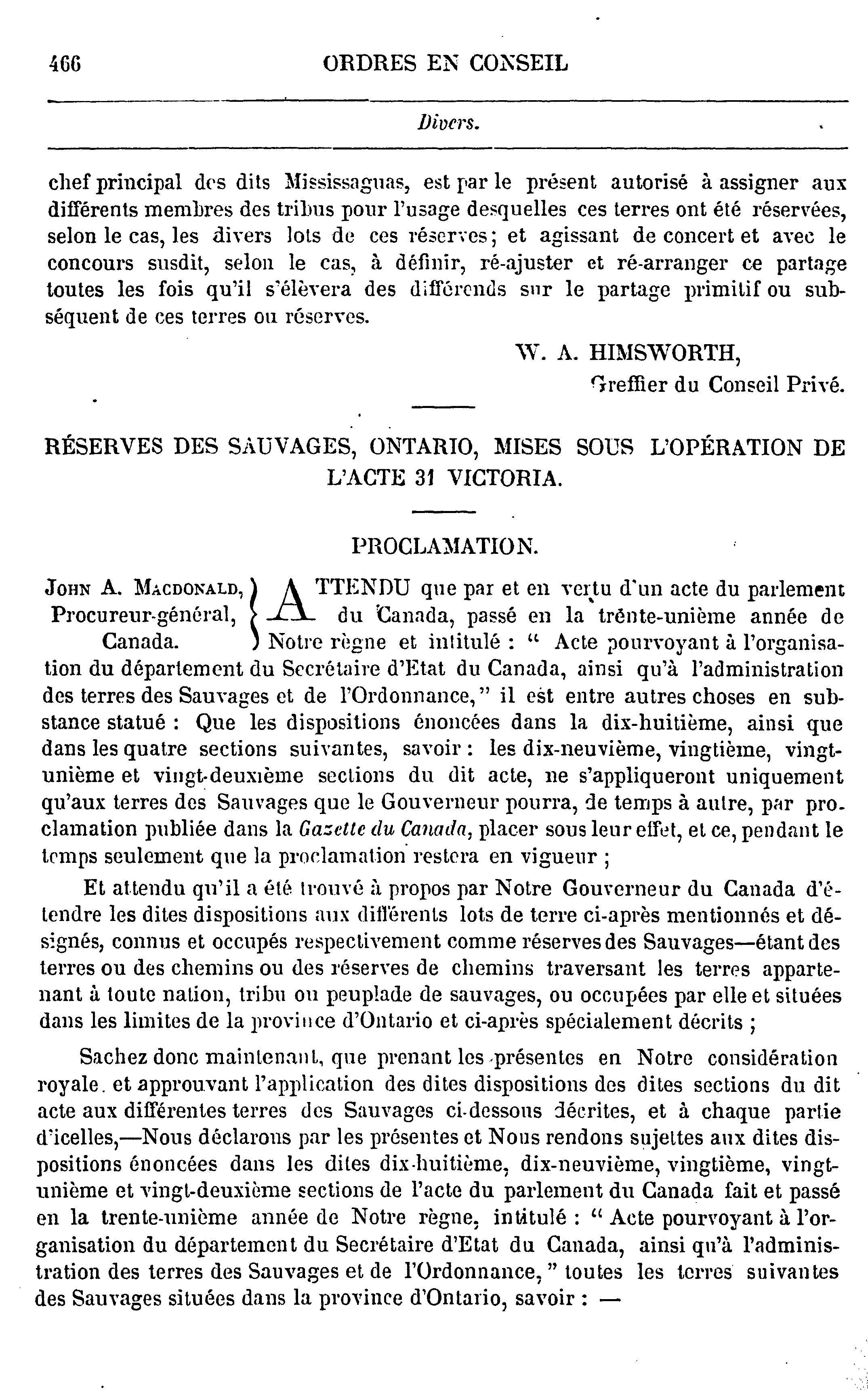 Ordres en conseil, proclamations, règlements des départements, etc. ayant force de loi dans la puissance du Canada.