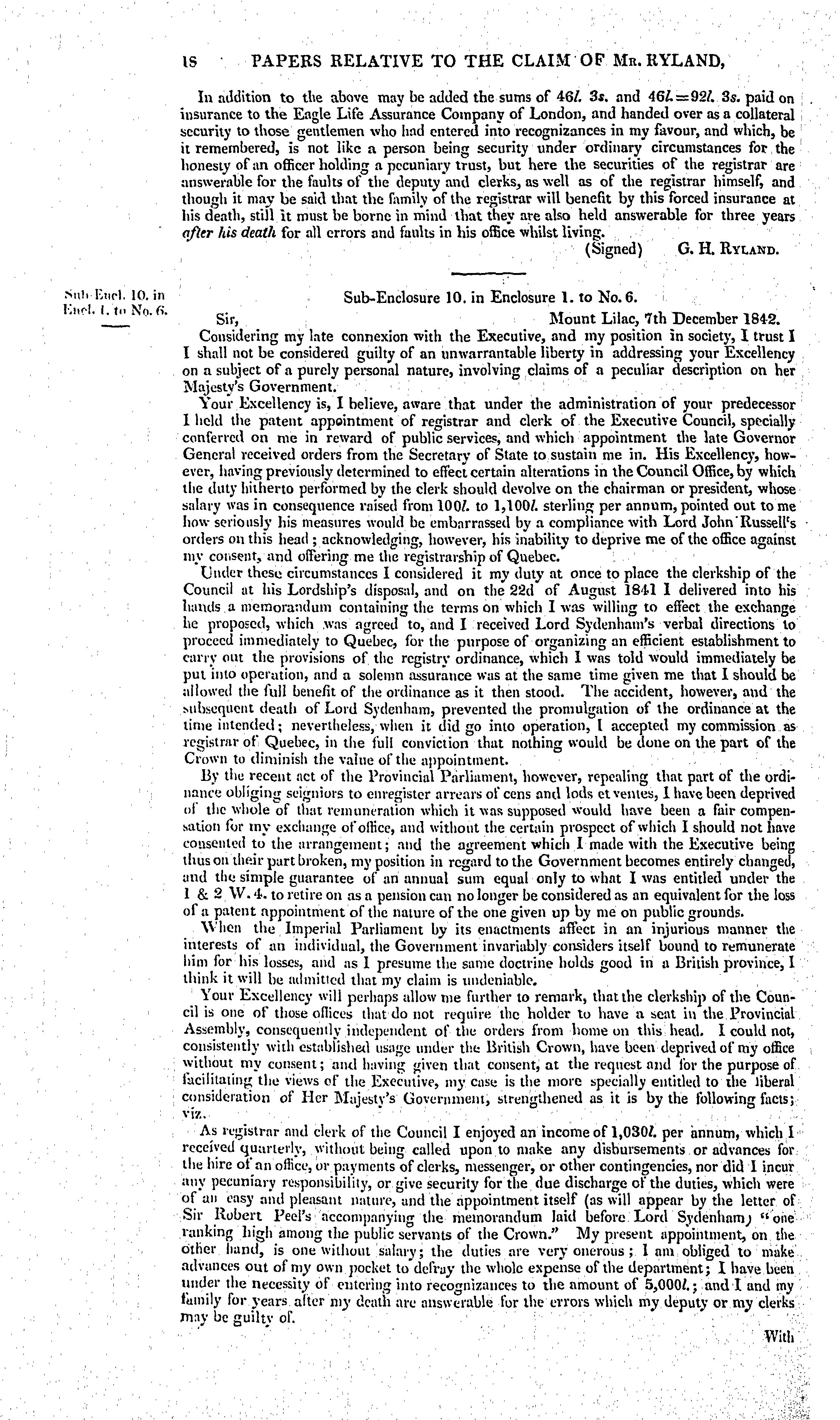 Papers relative to the claim of Mr. Ryland, formerly secretary to Executive Council, Canada