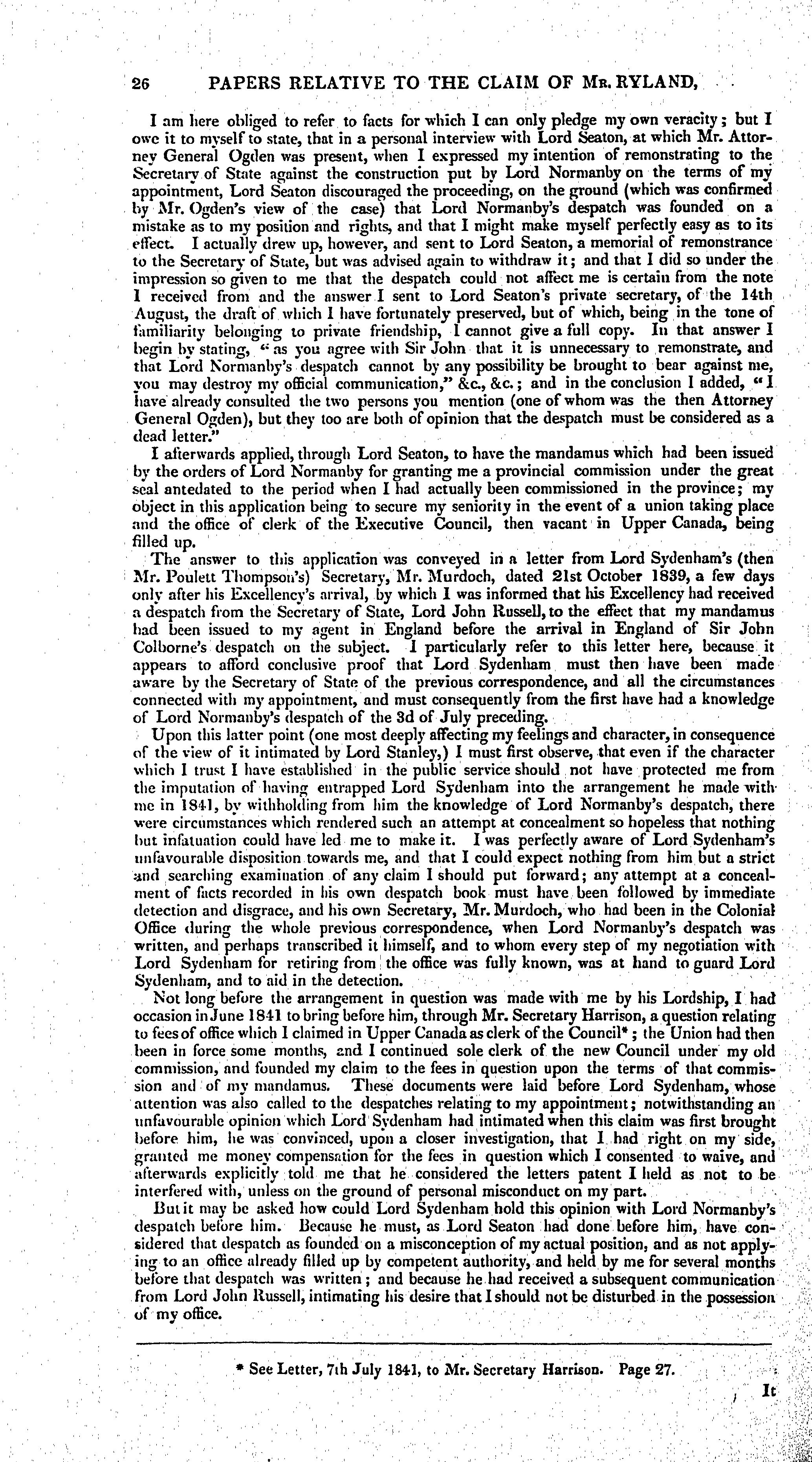 Papers relative to the claim of Mr. Ryland, formerly secretary to Executive Council, Canada