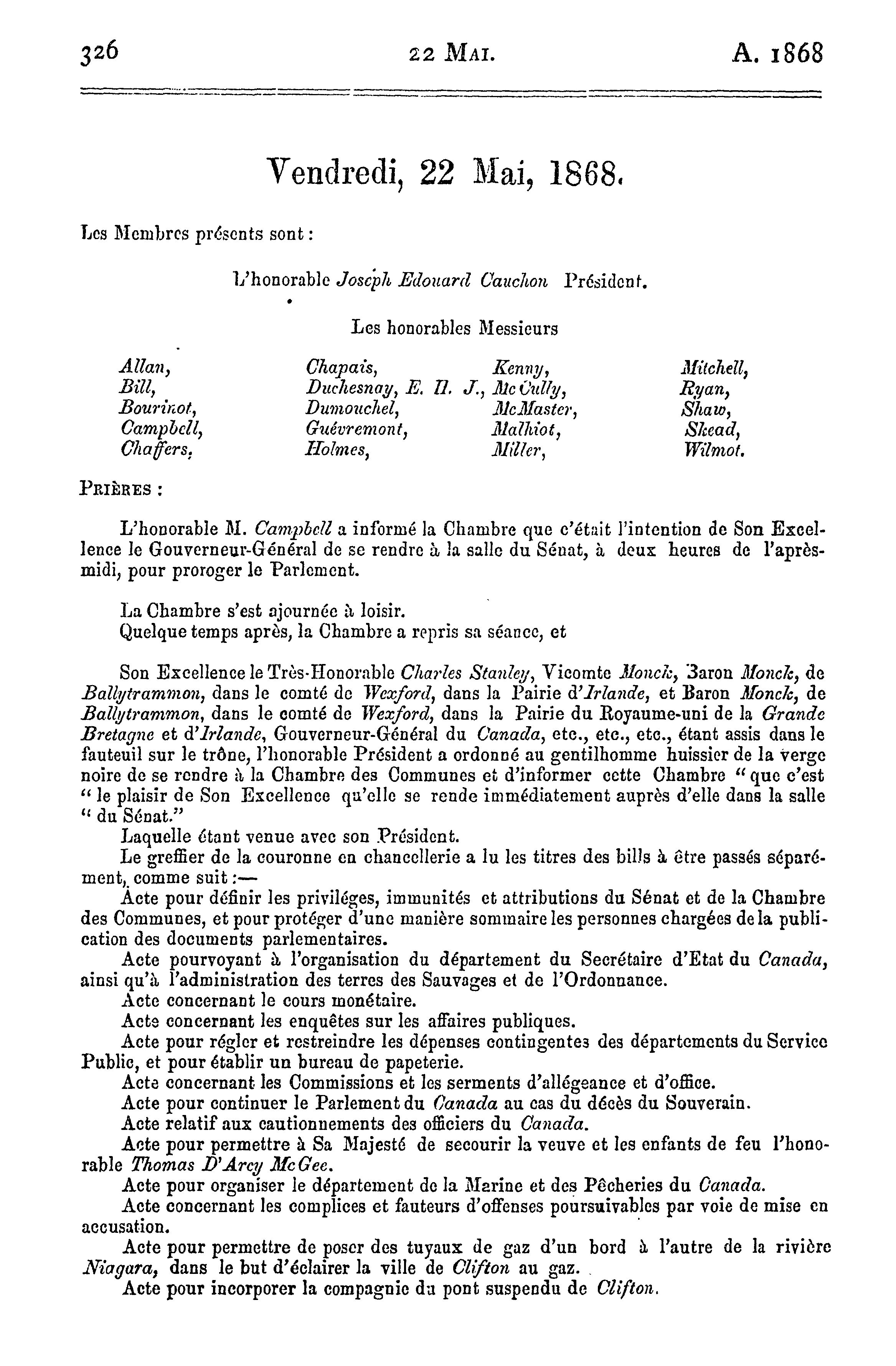 Appendice au premier volume des Journaux du Sénat du Canada, session 1867-8