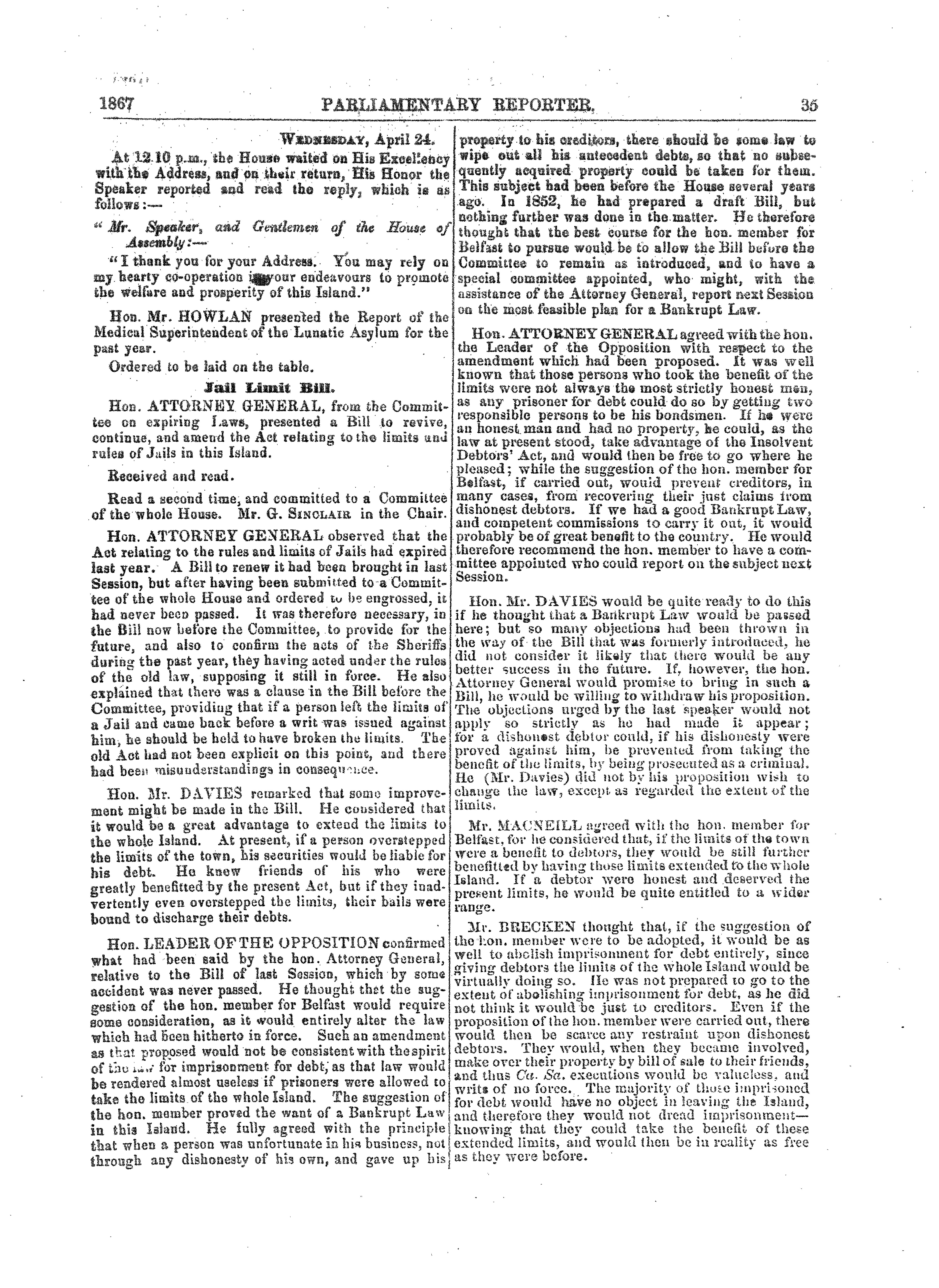 The Parliamentary reporter, or, Debates and proceedings of the House of Assembly of Prince Edward Island, for the year 1867, being the first Session of the twenty-third General Assembly : 1867