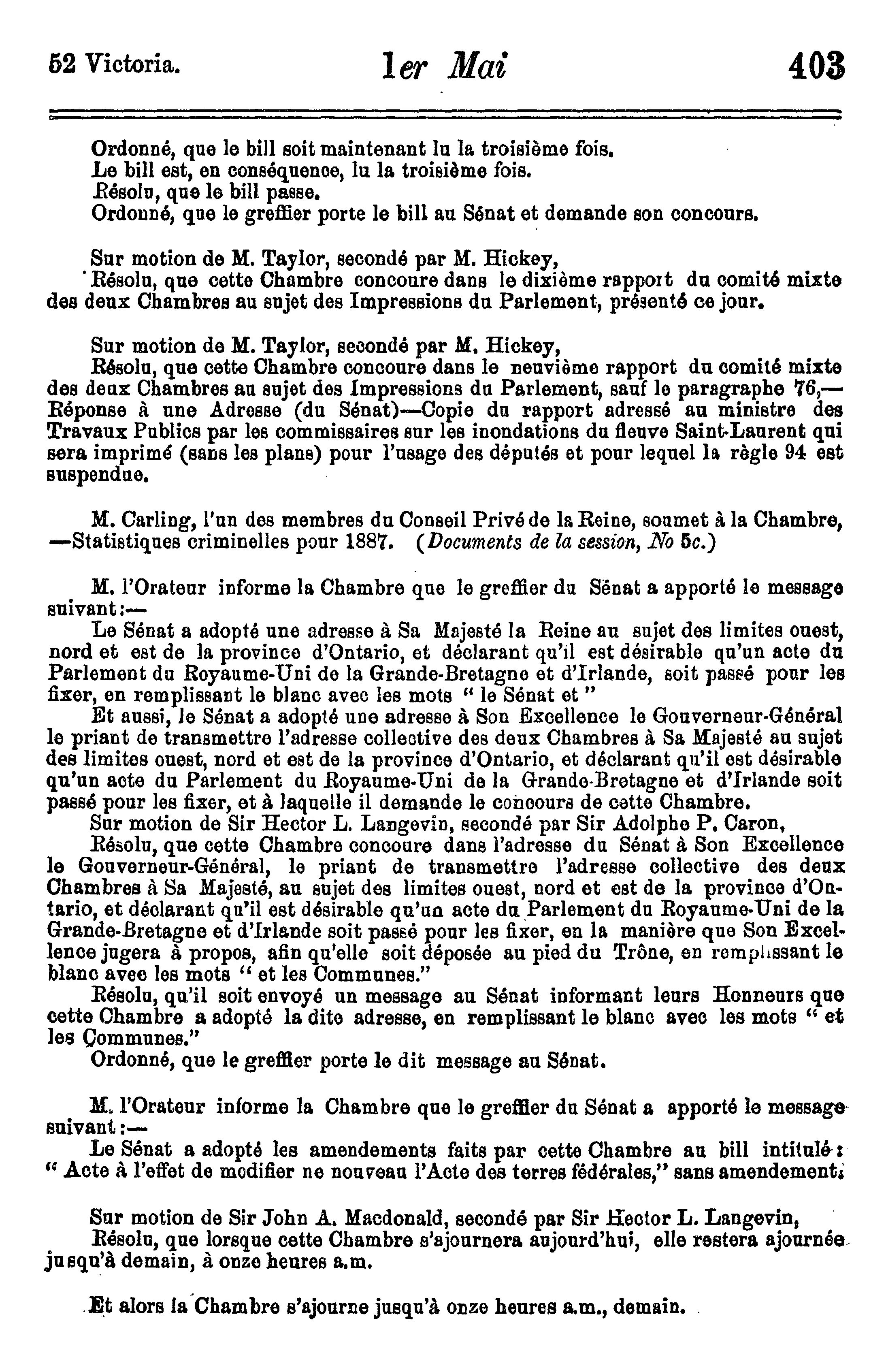 Journaux de la Chambre des communes du Canada du 31 janvier au 2 mai 1889, ces deux jours inclus, dans la cinquante-deuxième année du règne de Sa Majesté la Reine Victoria : étant la 3e session du 6e parlement du Canada, session 1889 : 1889