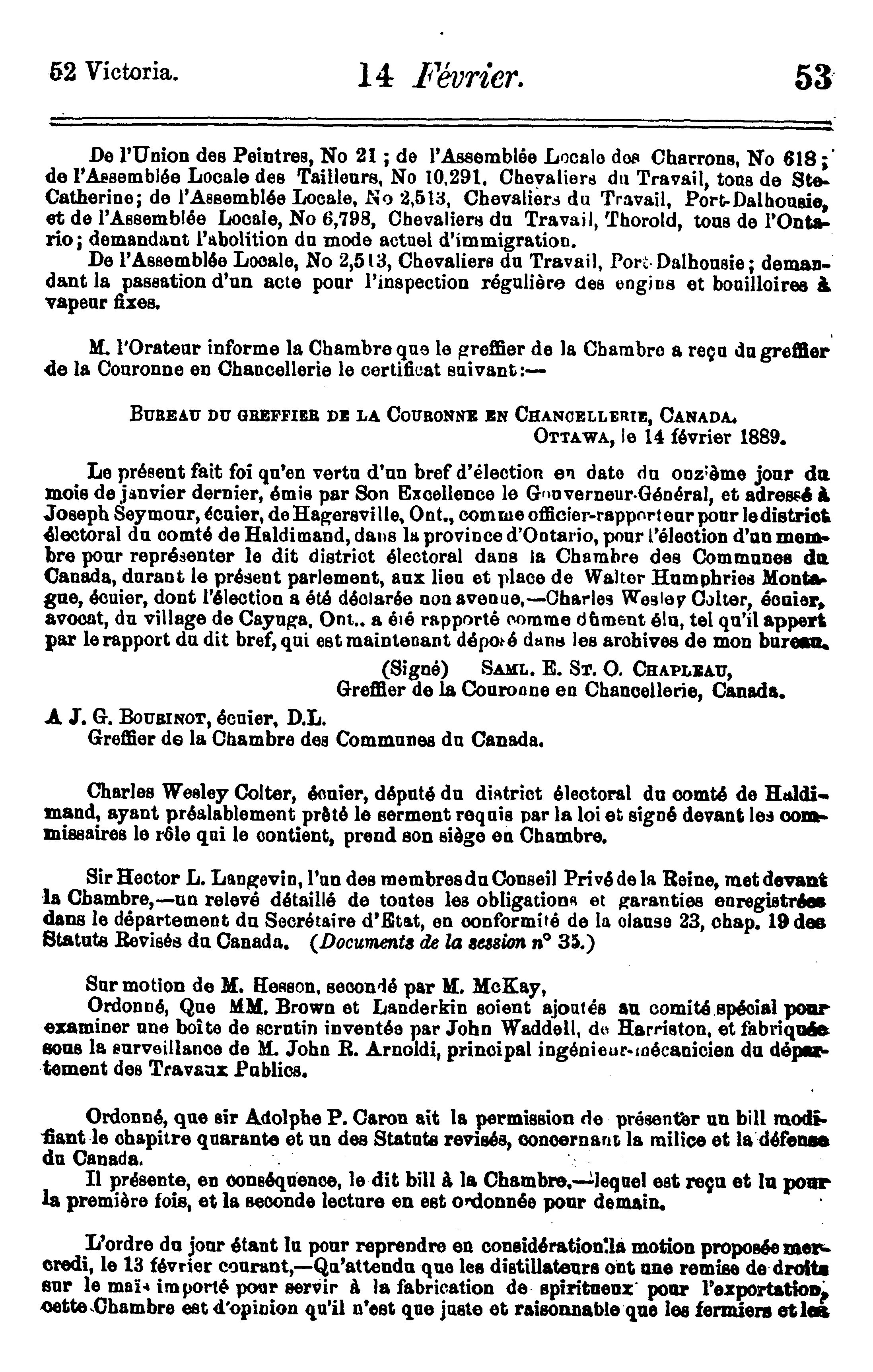 Journaux de la Chambre des communes du Canada du 31 janvier au 2 mai 1889, ces deux jours inclus, dans la cinquante-deuxième année du règne de Sa Majesté la Reine Victoria : étant la 3e session du 6e parlement du Canada, session 1889 : 1889