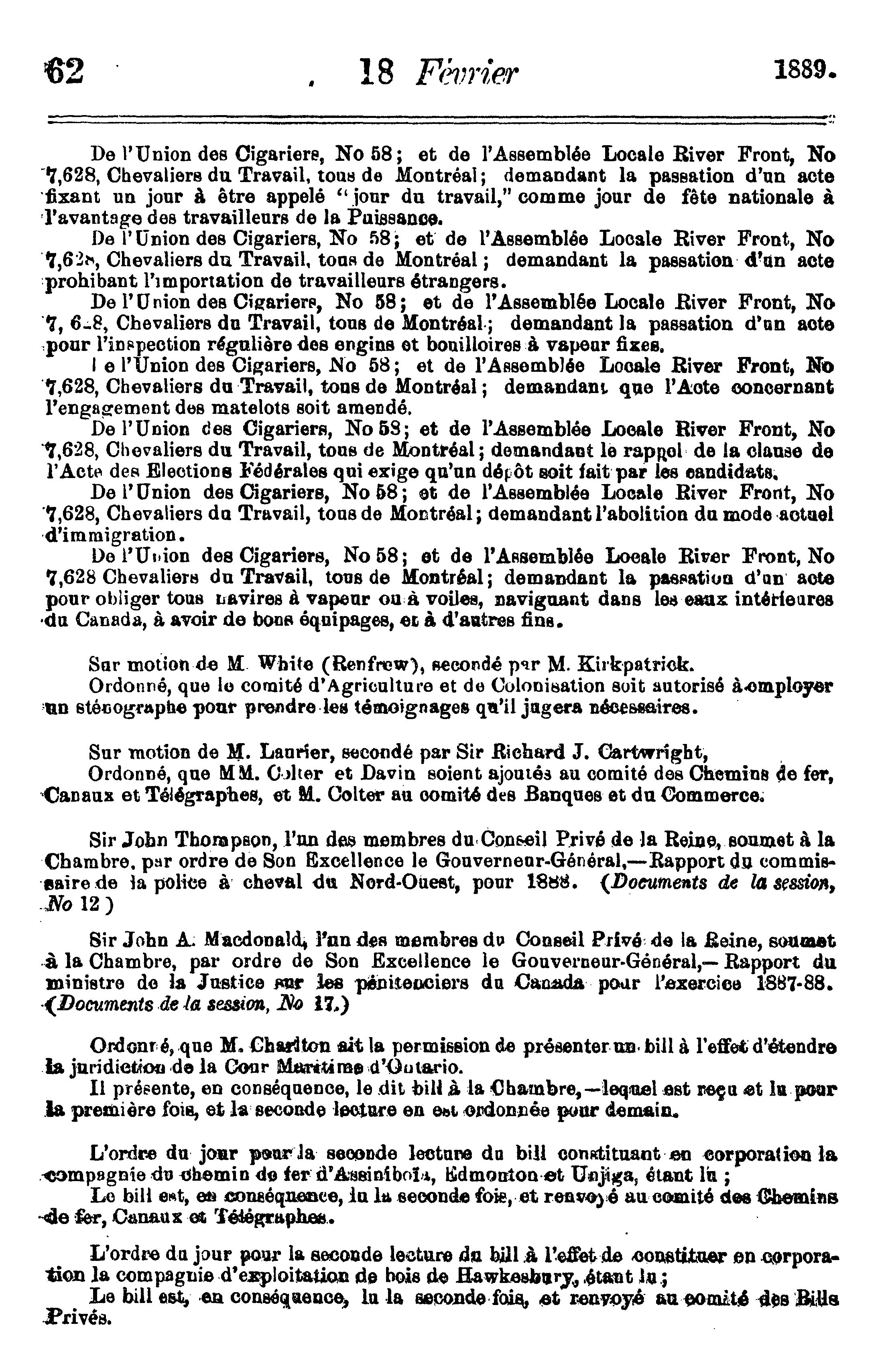 Journaux de la Chambre des communes du Canada du 31 janvier au 2 mai 1889, ces deux jours inclus, dans la cinquante-deuxième année du règne de Sa Majesté la Reine Victoria : étant la 3e session du 6e parlement du Canada, session 1889 : 1889