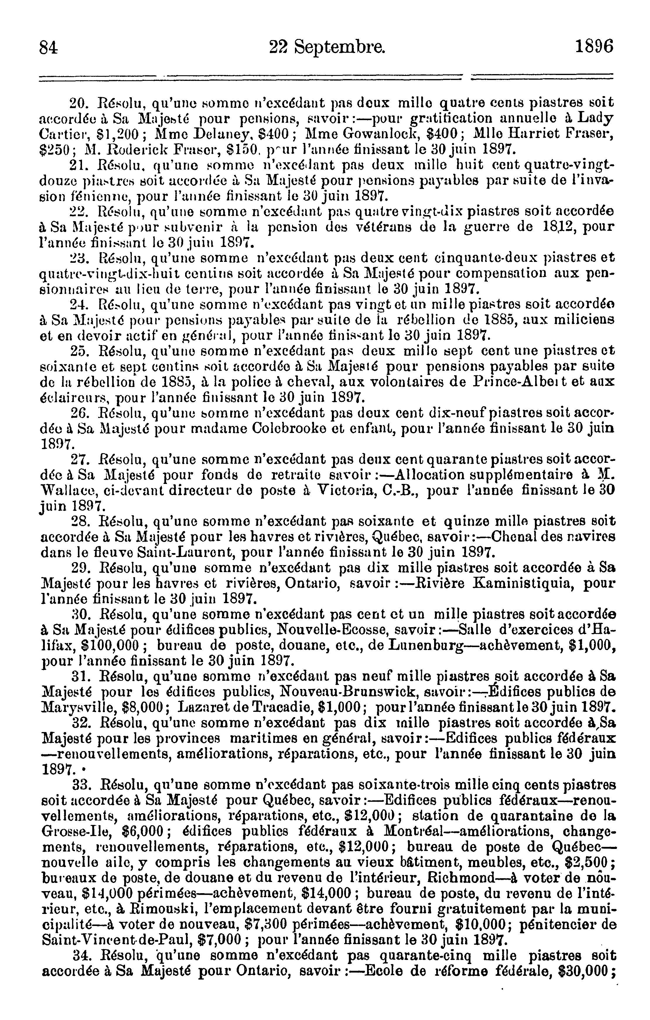 - Journaux de la Chambre des communes du Canada du 19 août au 5 octobre 1896, inclusivement, dans la soixantième année du règne de Notre Souveraine Dame la Reine Victoria, première session du huitième parlement du Canada, session 1896 : 1896