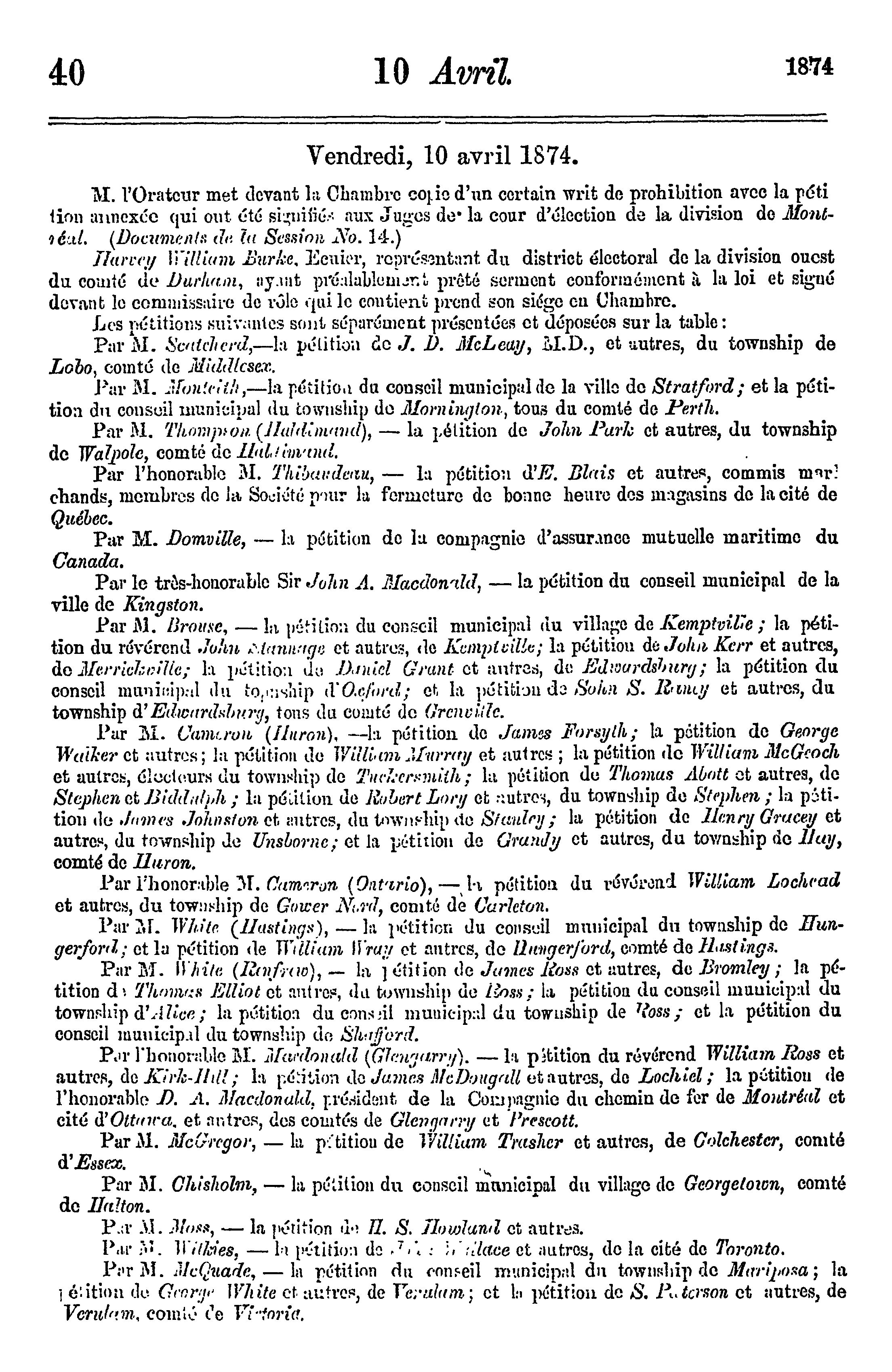 Journaux de la Chambre des communes de la puissance du Canada depuis le 26 mars jusqu'au 26 mai 1874, les deux jours inclus, dans la trente-septième année du règne de notre souveraine dame la Reine Victoria, première session du 3me parlement du Canada, session 1874 : 1874