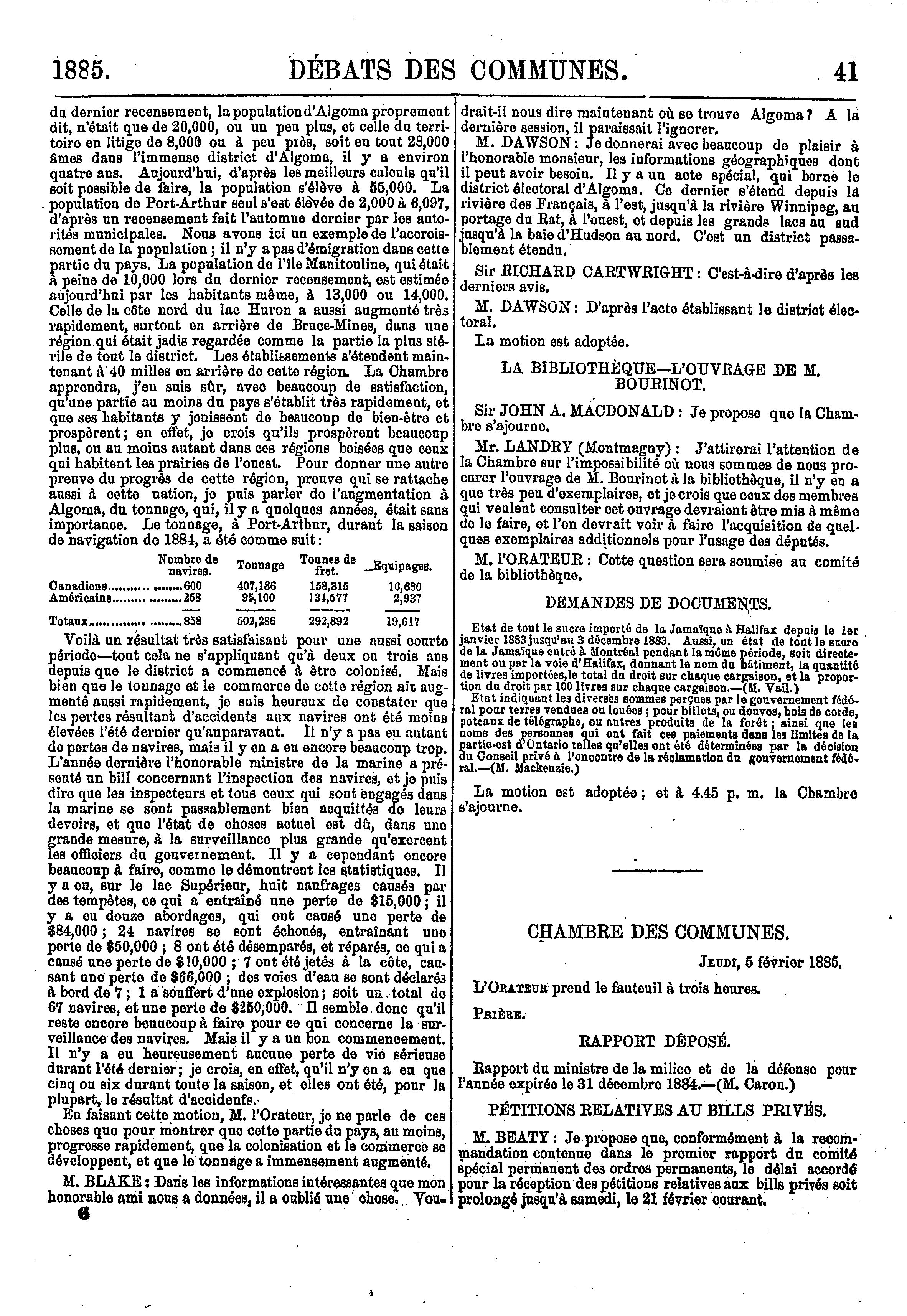Compte-rendu officiel des débats de la Chambre des communes du Canada : troisième session, cinquième parlement, 48-49 Victoria, 1885, vol. XVII, du vingt-neuvième jour de janvier au vingt-sixième jour de mars 1885 : 1885 (ptie 1)