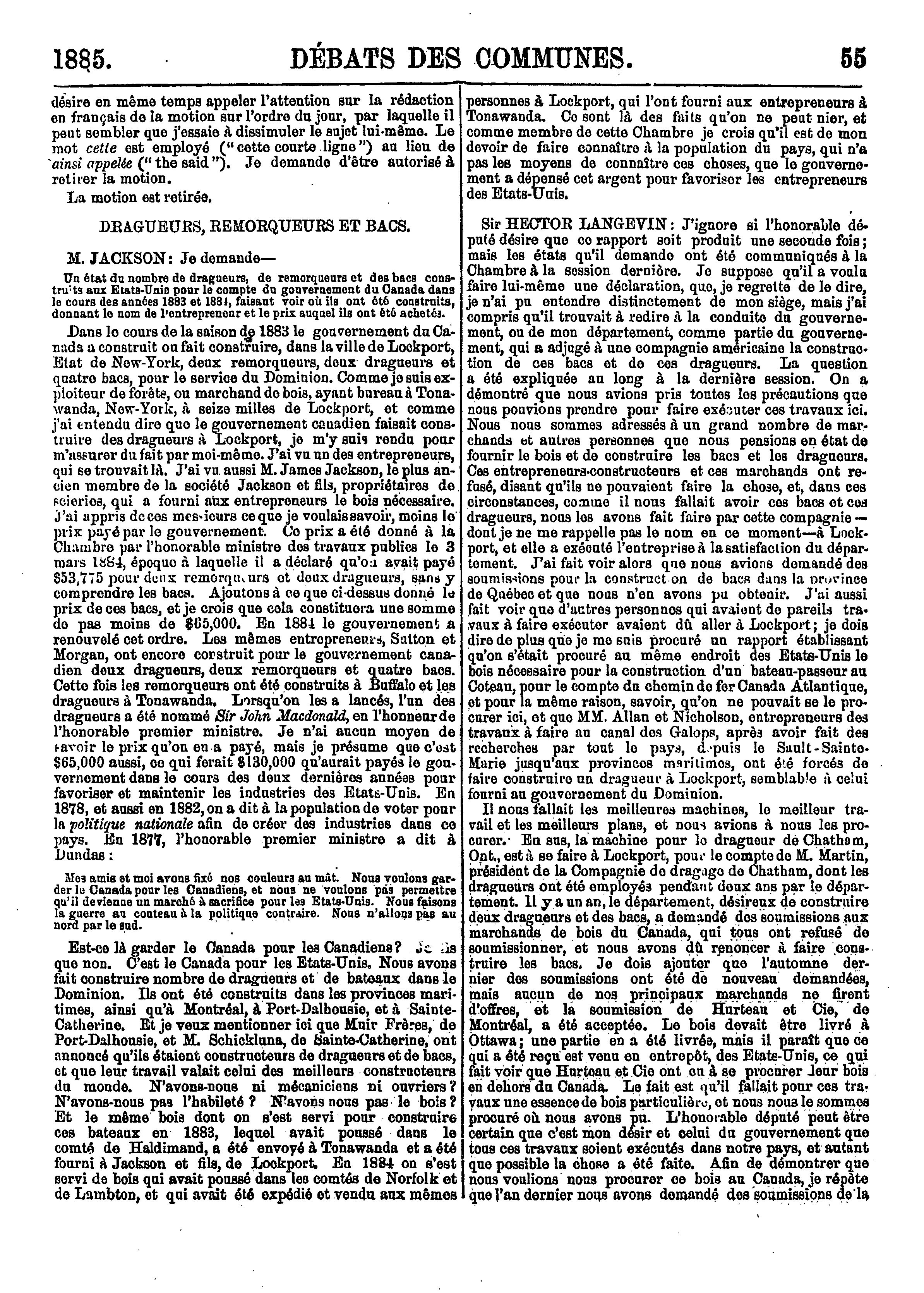 Compte-rendu officiel des débats de la Chambre des communes du Canada : troisième session, cinquième parlement, 48-49 Victoria, 1885, vol. XVII, du vingt-neuvième jour de janvier au vingt-sixième jour de mars 1885 : 1885 (ptie 1)