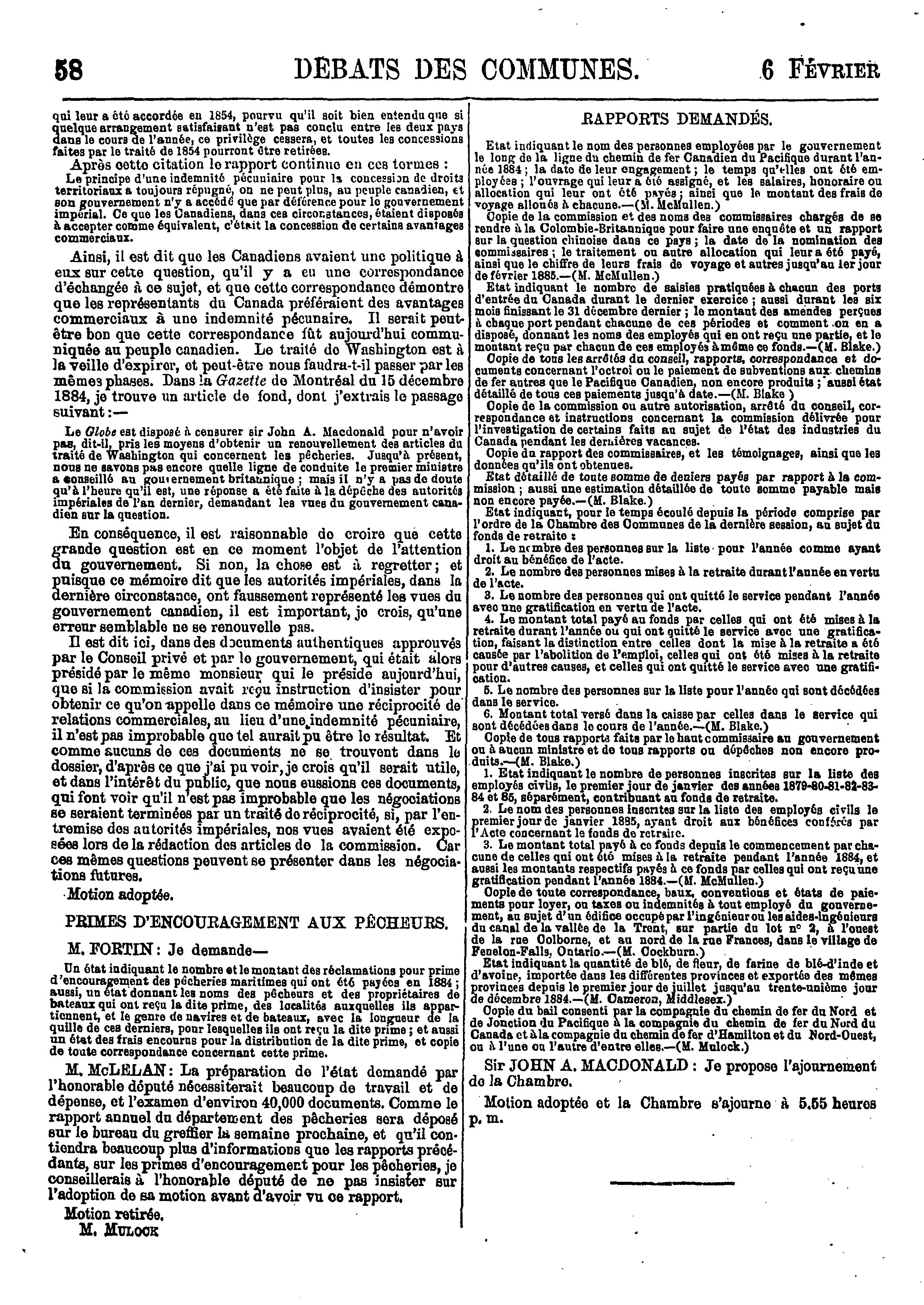 Compte-rendu officiel des débats de la Chambre des communes du Canada : troisième session, cinquième parlement, 48-49 Victoria, 1885, vol. XVII, du vingt-neuvième jour de janvier au vingt-sixième jour de mars 1885 : 1885 (ptie 1)