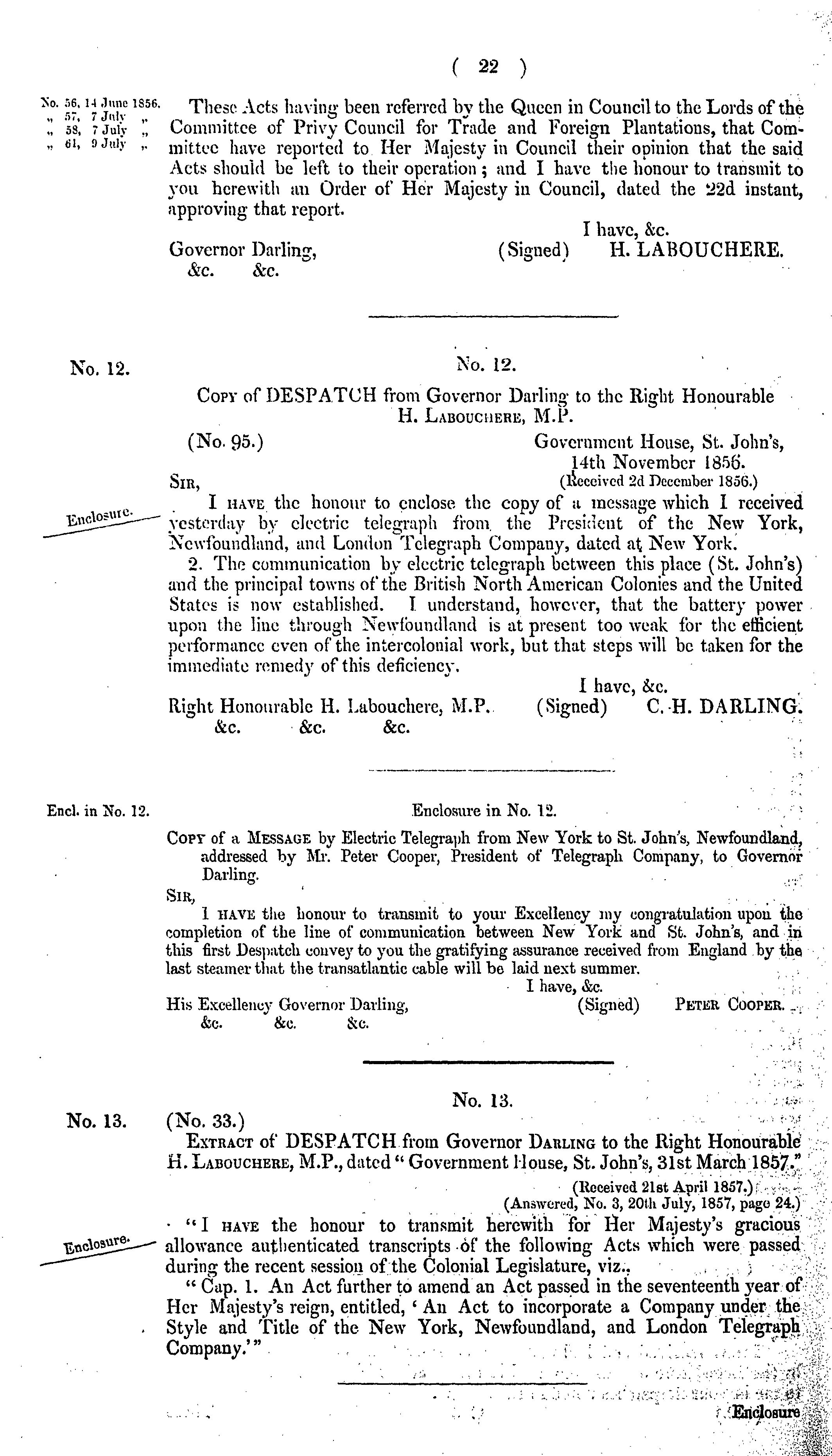Laws and correspondence concerning the New York, Newfoundland and London Telegraph Company.