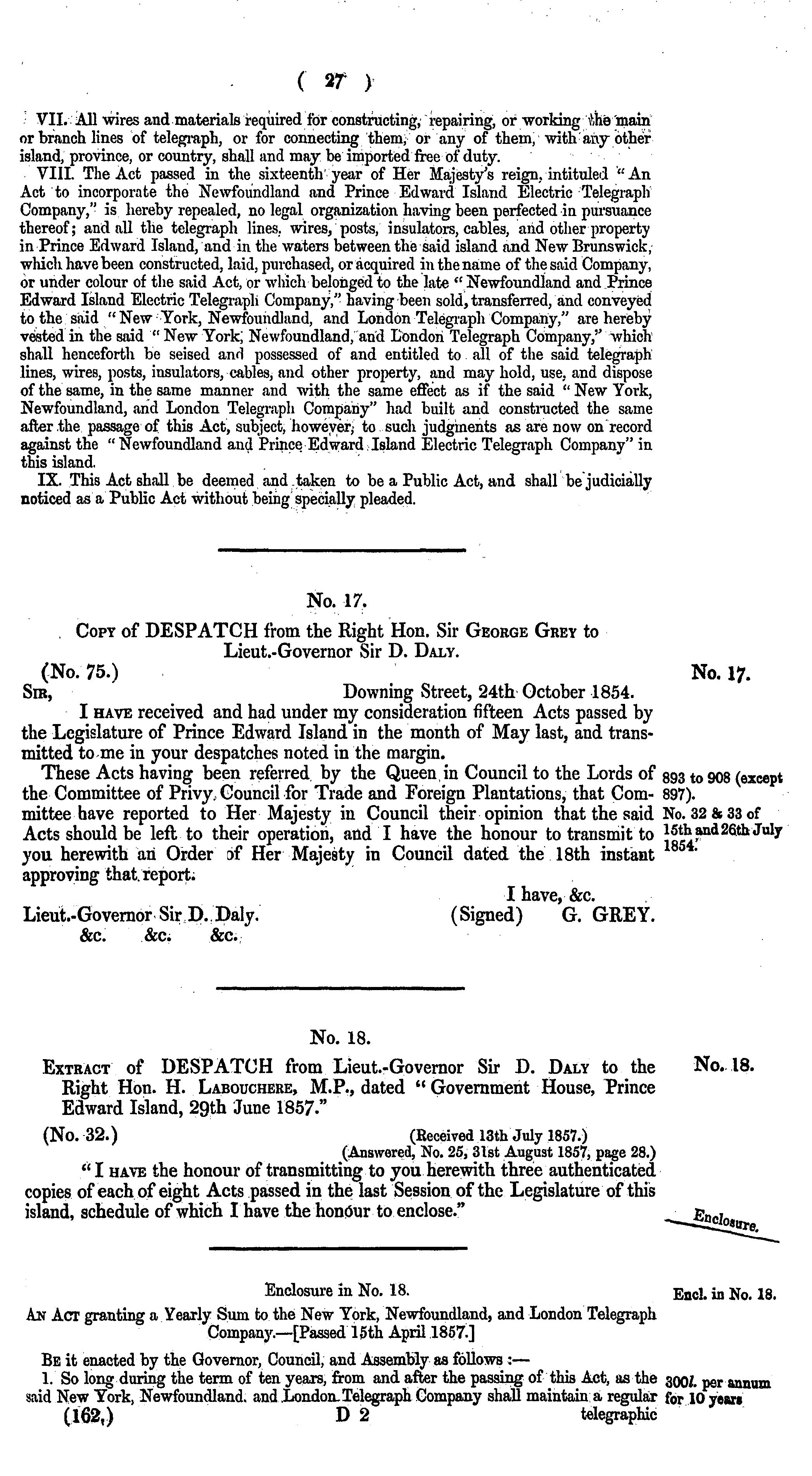 Newfoundland, &c. : return to an address of the House of Lords, dated 23d April 1858, for copies or extracts of any correspondence between the Secretary of State and the government of Newfoundland and the other North American colonies, with respect to any acts passed for giving an exclusive right to the establishment of telegraphic communication between this country and North America to one company. - Published