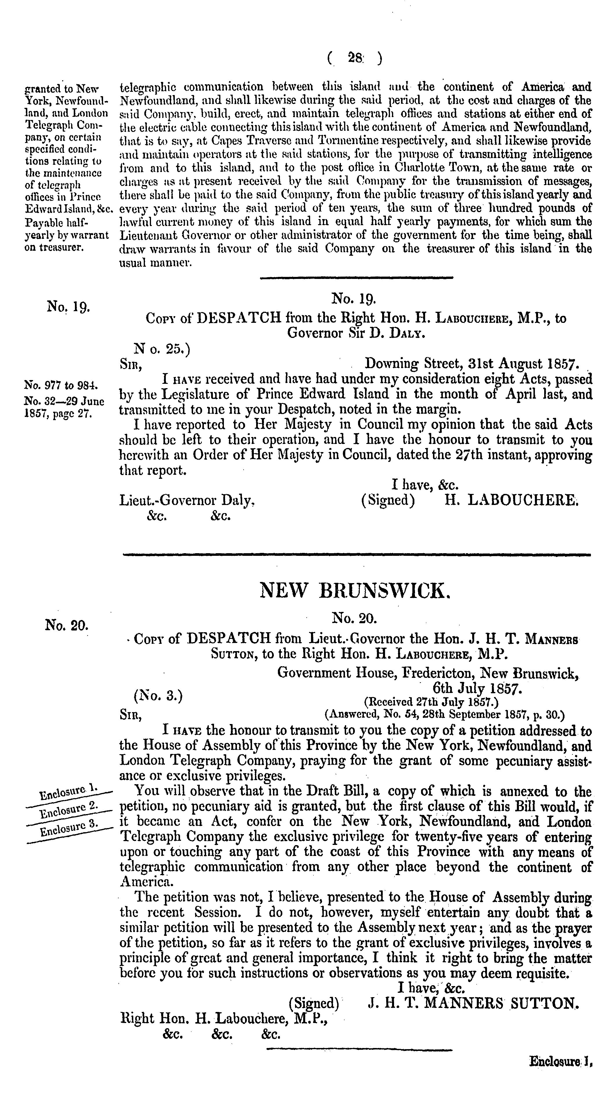 Laws and correspondence concerning the New York, Newfoundland and London Telegraph Company.