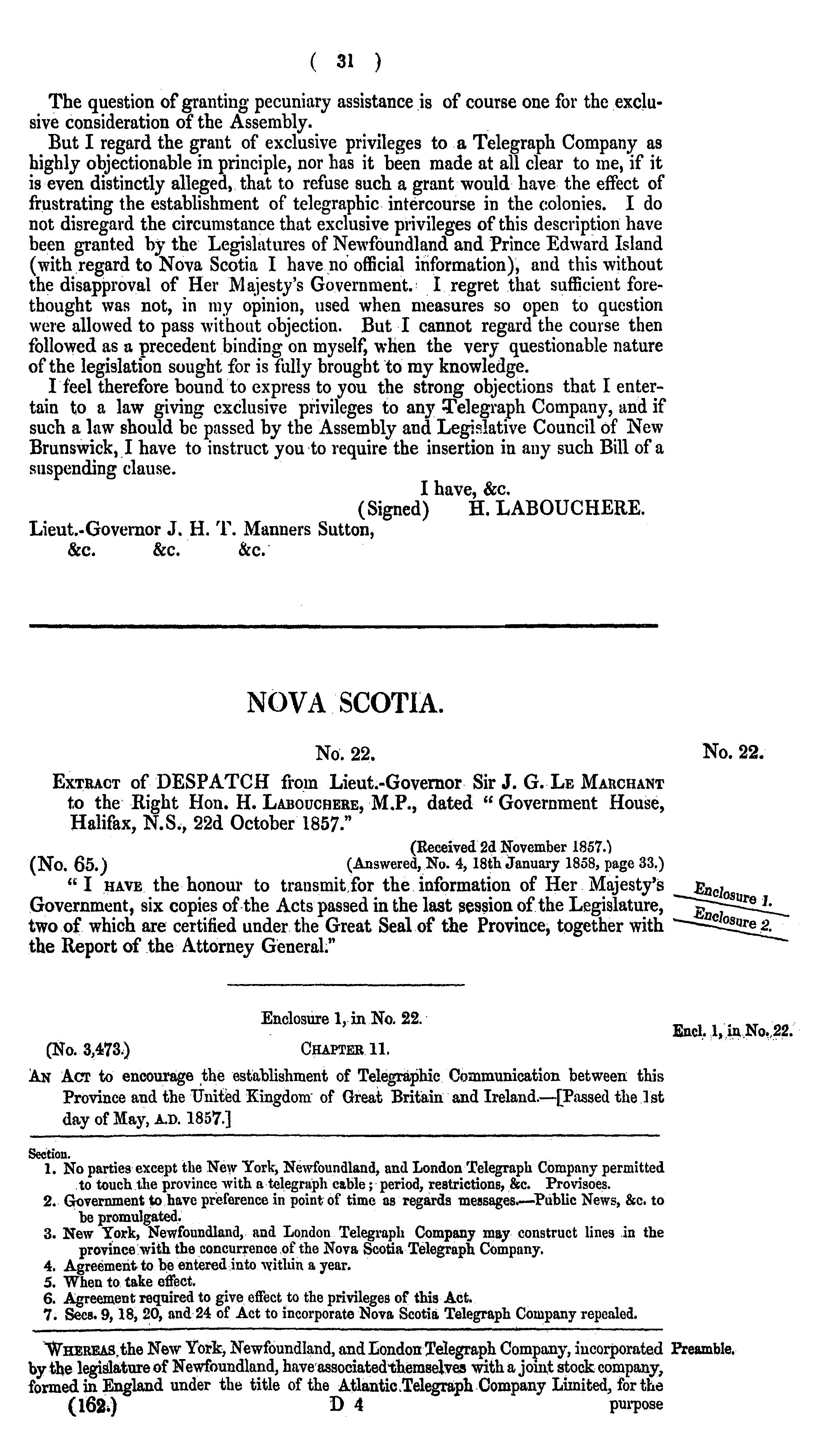 Laws and correspondence concerning the New York, Newfoundland and London Telegraph Company.