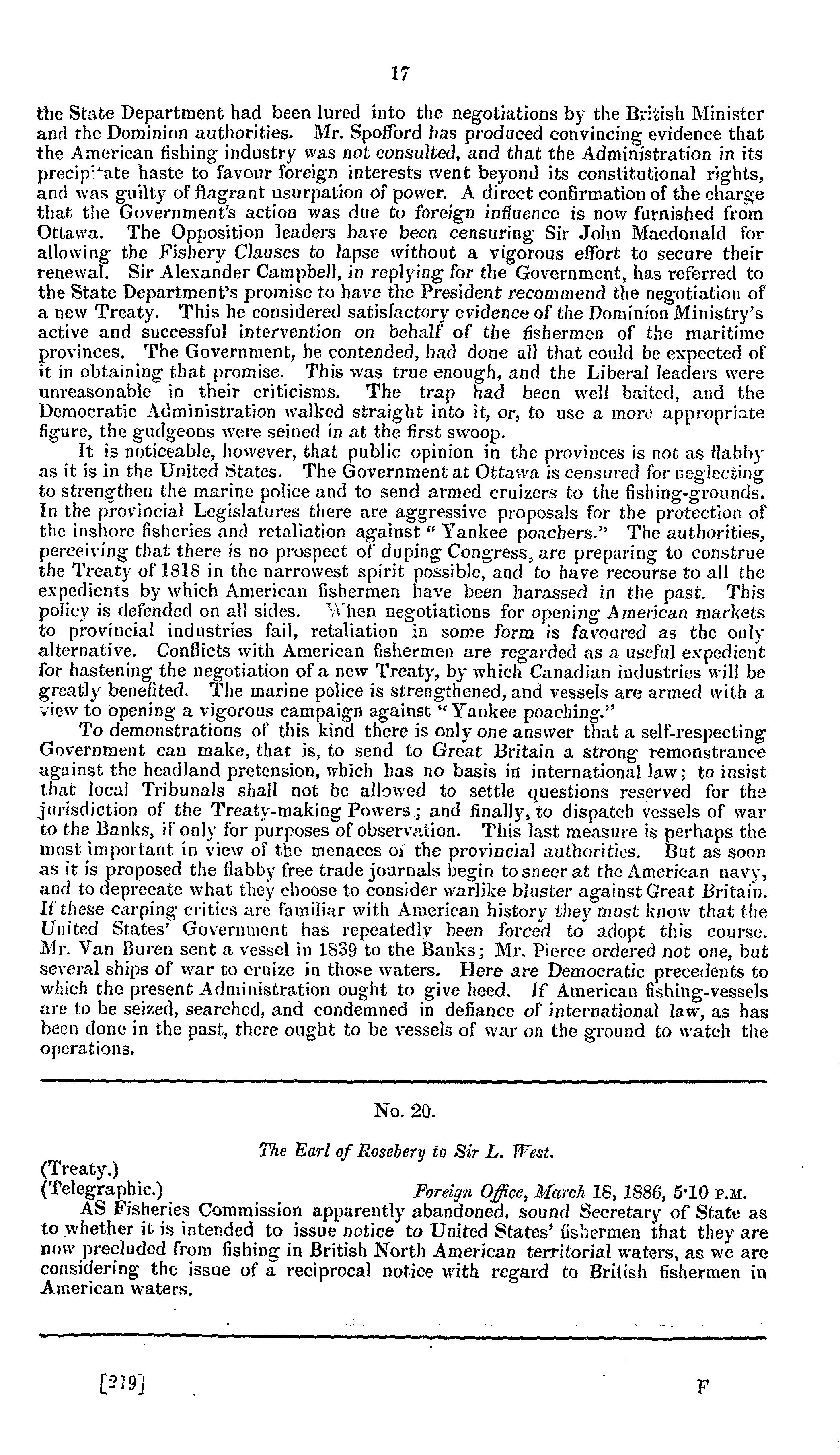 Further correspondence respecting the termination of the fishery articles of the Treaty of Washington of the 8th May, 1871 : January to June 1886. - Adresse bibliographique