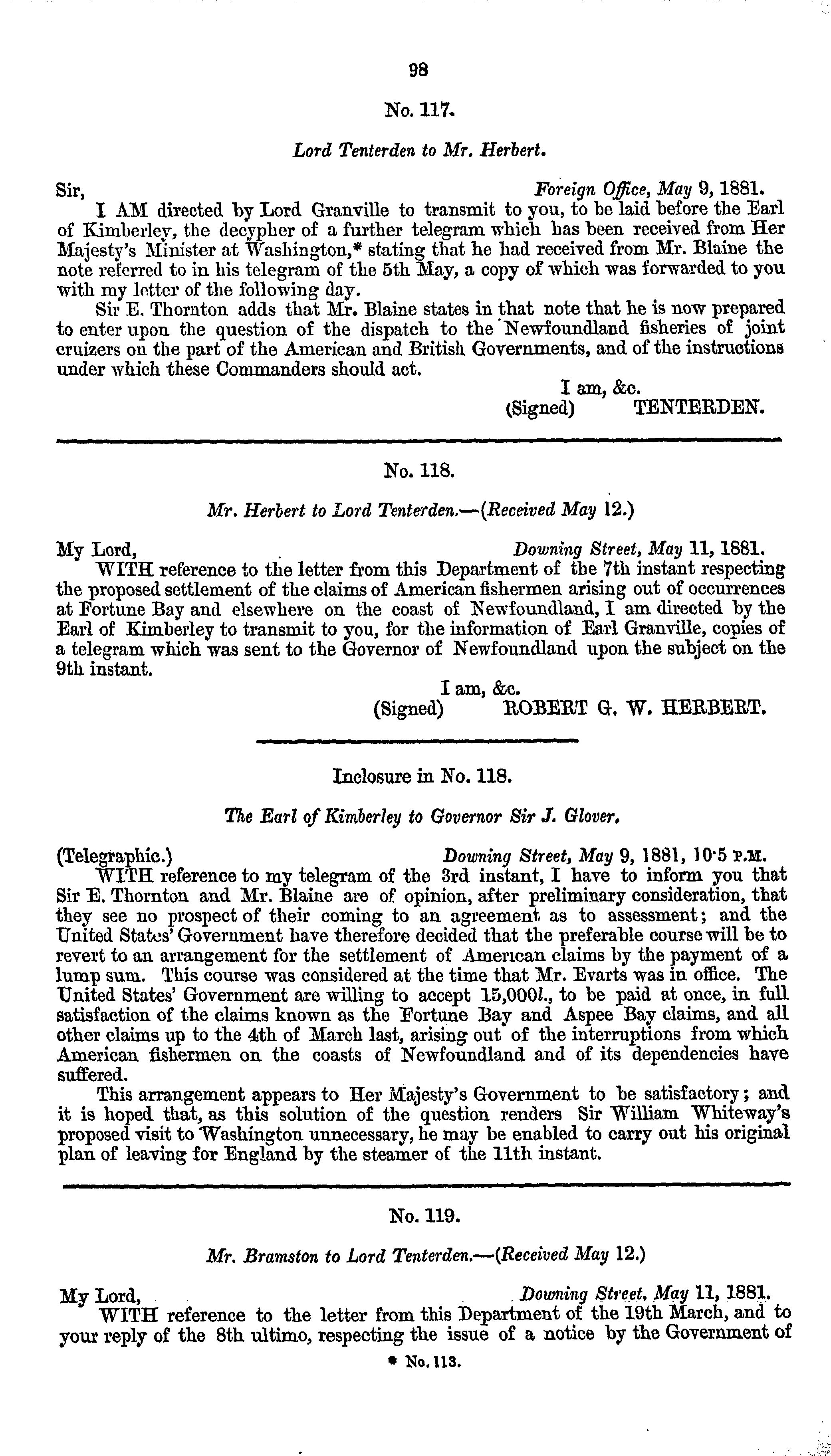 Further correspondence respecting the occurrences at Fortune Bay, Newfoundland, and other places (in continuation of "United States No. 1 (1881).").