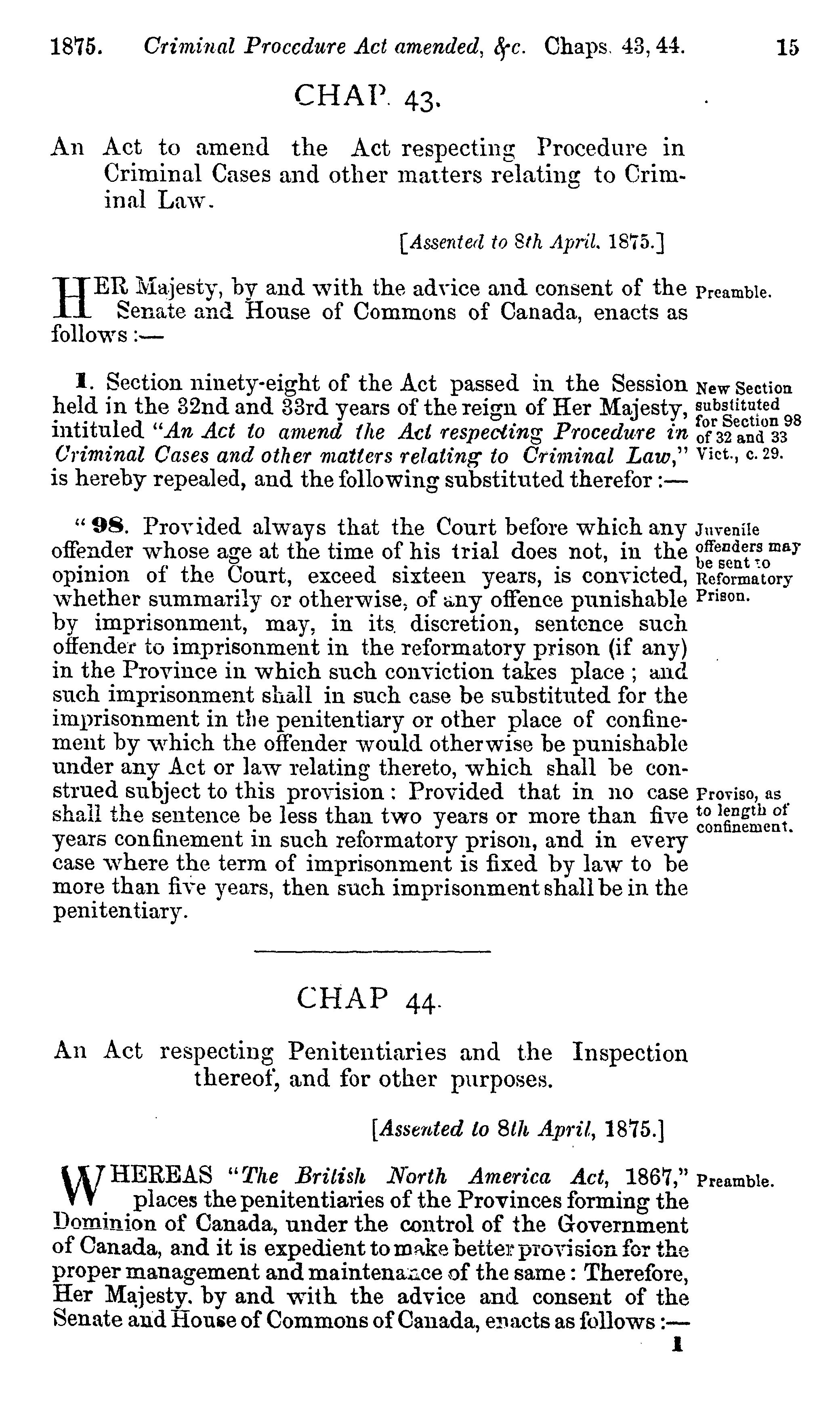 "This volume is a reprint of such Statutes of the Parliament of Canada, passed from 1875 to 1877, both inclusive, as have reference exclusively (or almost entirely so) to Criminal Law or Procedure." Cf. pages [3]