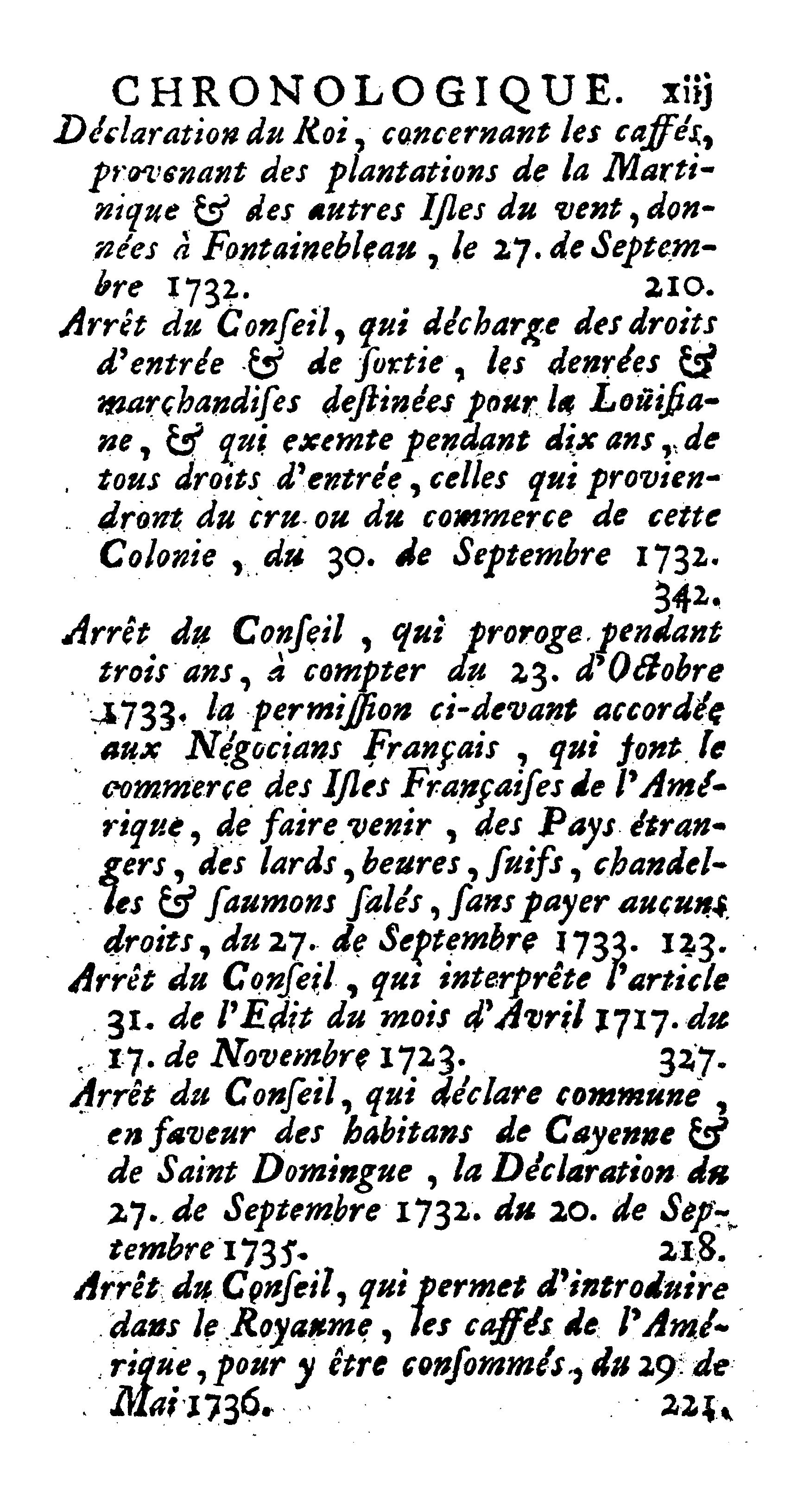 "Table chronologique des reglemens contenus dans le Code Noir & l'Addition": pages [215]-220 (2e ptie.)