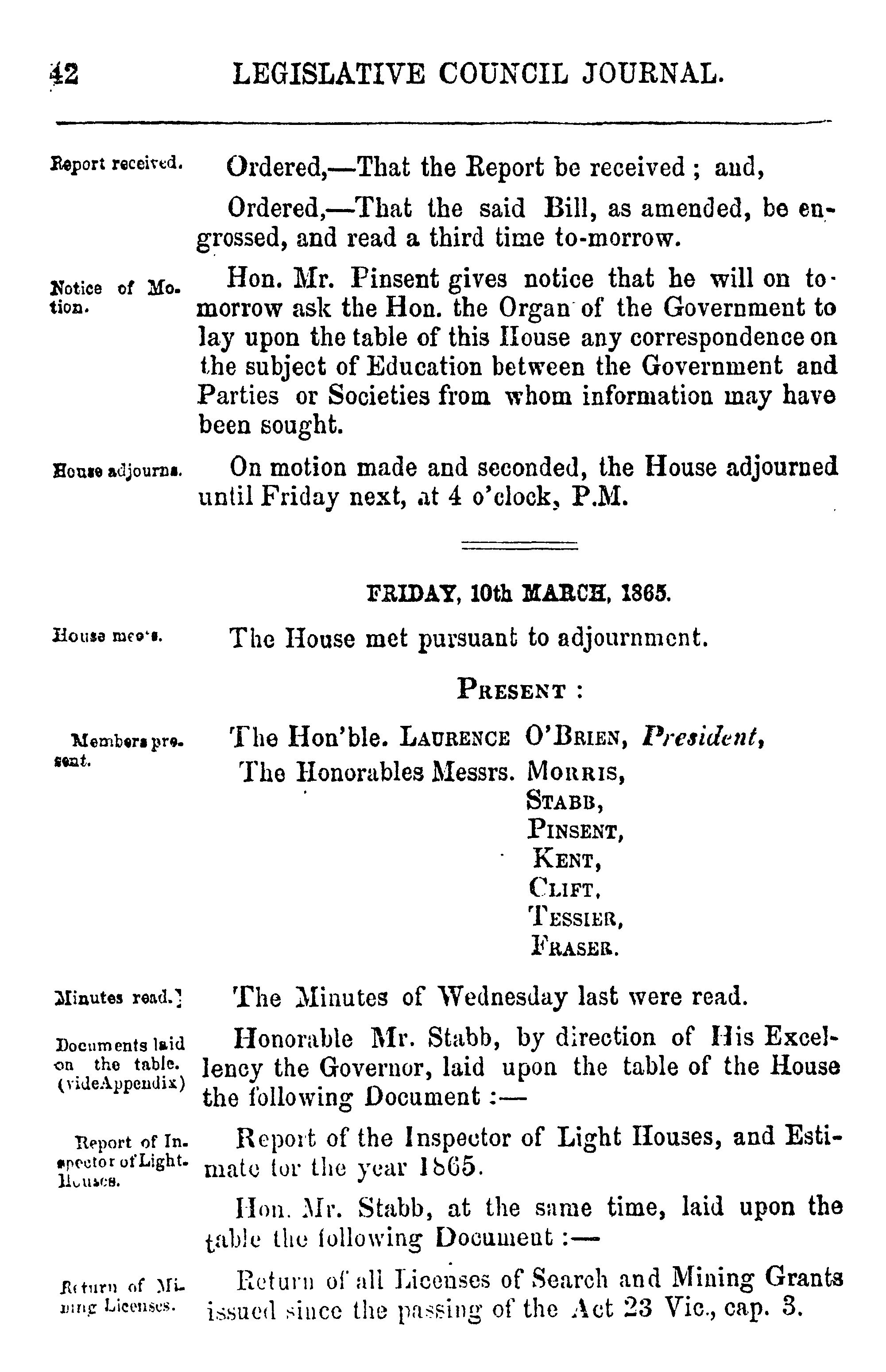 Journal of the Legislative Council of the Island of Newfoundland : being the fifth session of the eighth General Assembly, 1865 : 1865