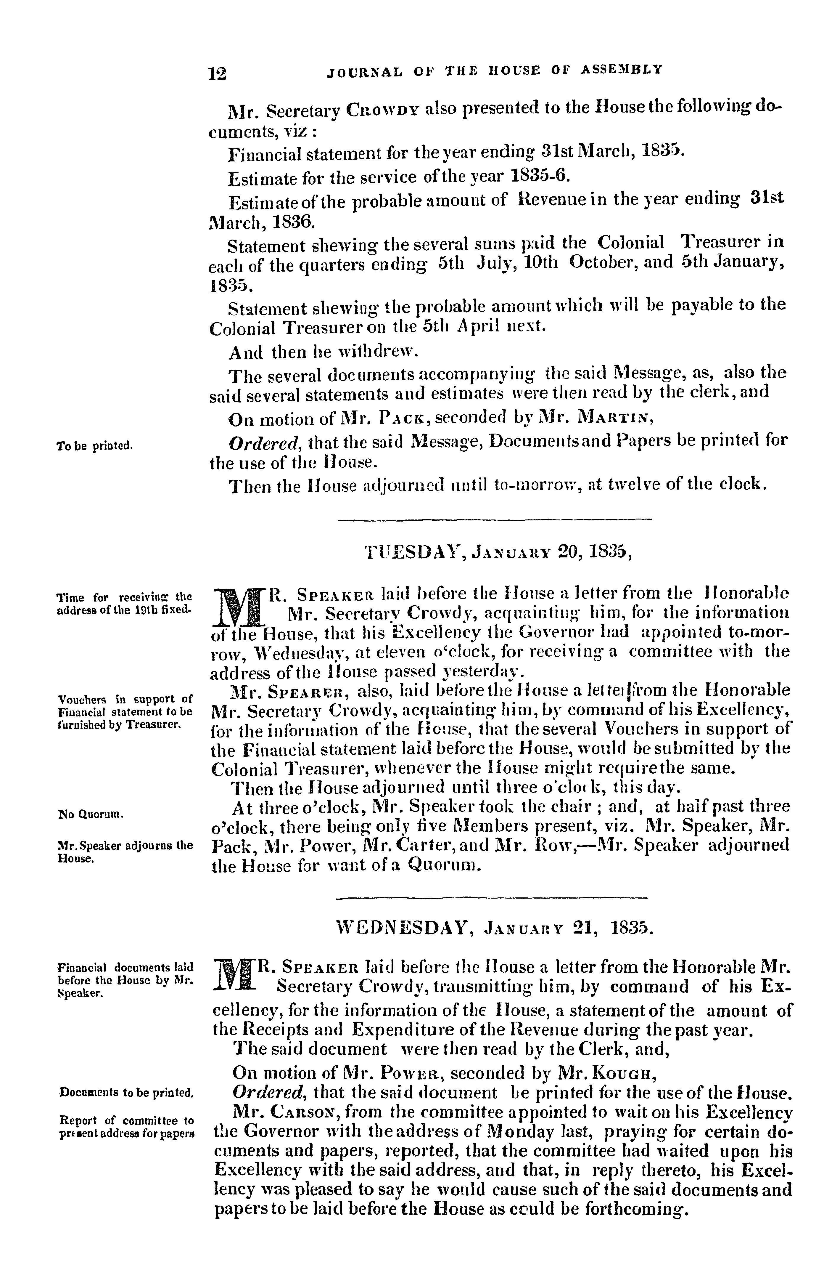 - Journal of the House of Assembly of Newfoundland : anno quinto regis Gulielmi IV, fifth session of the first General Assembly : 1835