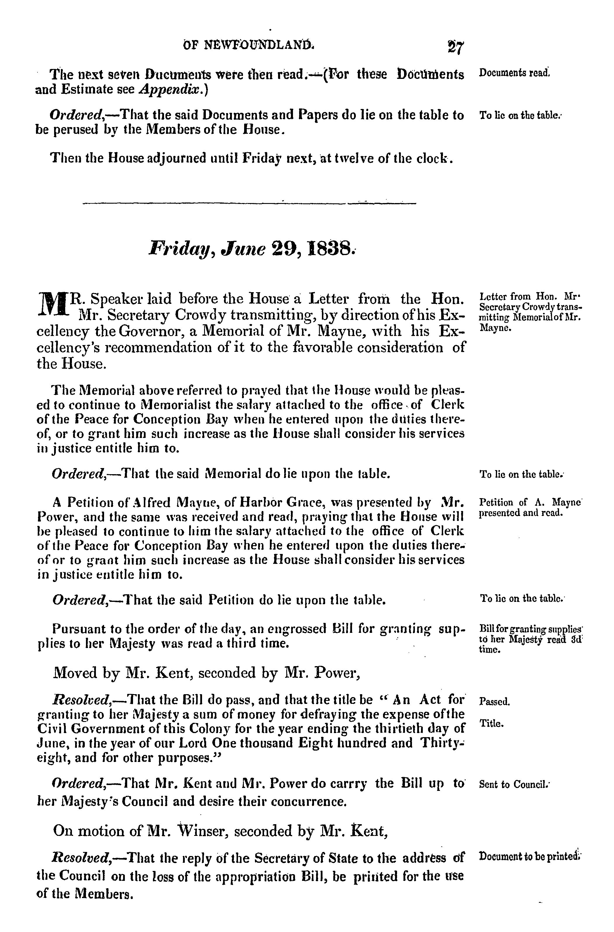 - Journal of the House of Assembly of Newfoundland : anno secundo regina Alexandrina Victoria I, second session of the second General Assembly : 1838
