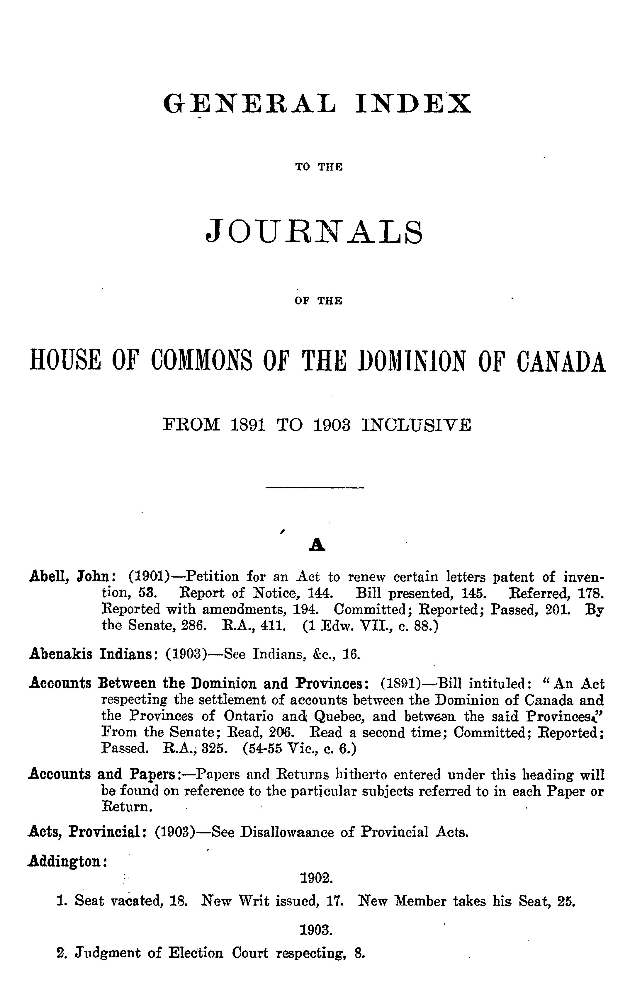 General index to the journals of the House of Commons of the Dominion of Canada and of the sessional papers of Parliament, from 1891 to 1903, inclusive