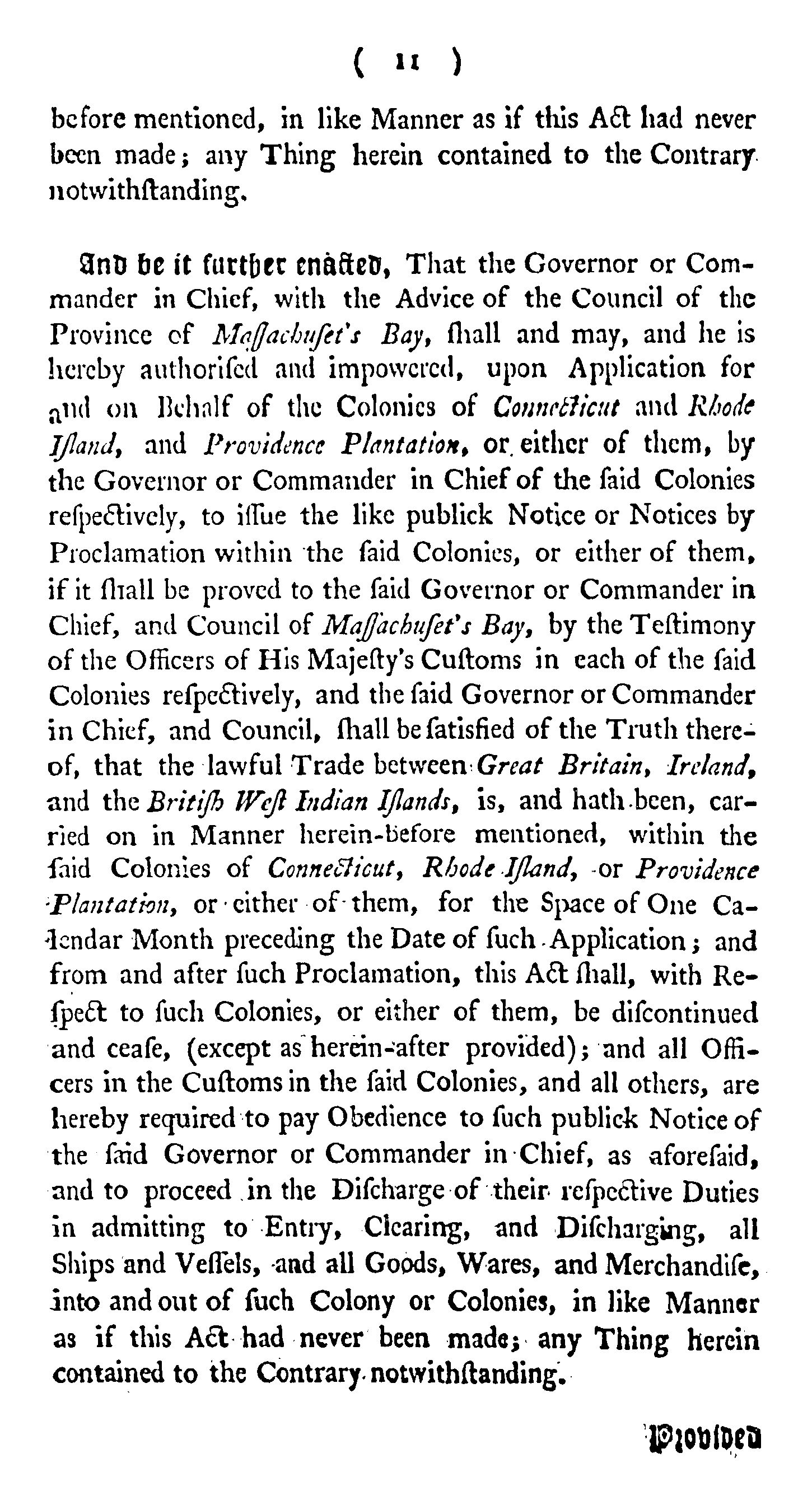 A bill, intituled an act to restrain the trade and commerce of the province of Massachuset's [sic] Bay, and New Hampshire, and colonies of Connecticut, and Rhode Island, and Providence Plantation, in North America, to Great Britain, Ireland, and the British Islands in the West Indies, and to prohibit such provinces and colonies from carrying on any fishery on the banks of Newfoundland, or other places therein mentioned, under certain conditions and limitations.