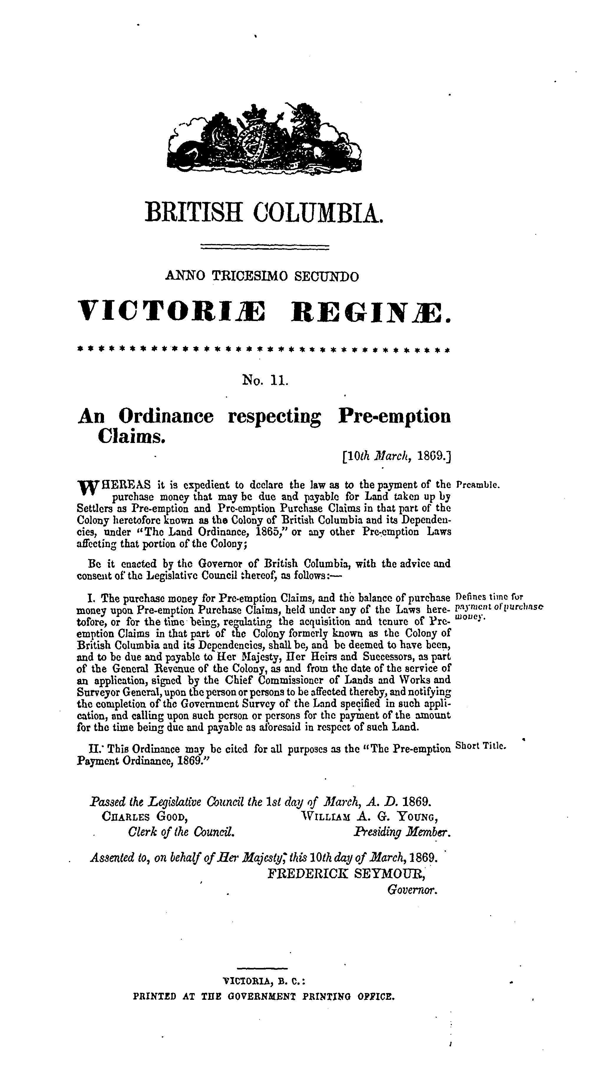Ordinances passed by the Legislative Council of British Columbia, during the session from 17th December to 15th March, 1868-9 : 1868/69