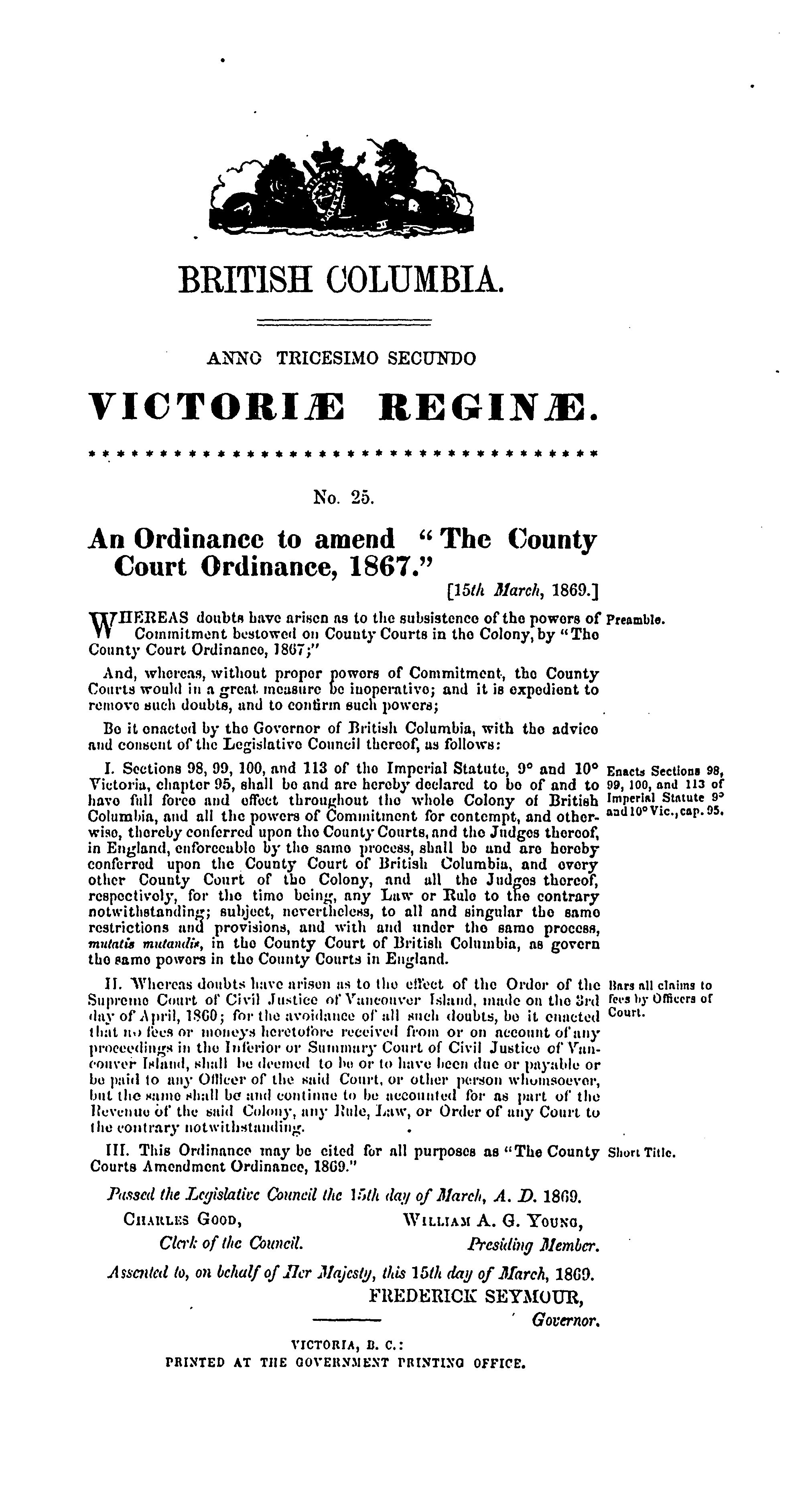 Ordinances passed by the Legislative Council of British Columbia, during the session from 17th December to 15th March, 1868-9 : 1868/69