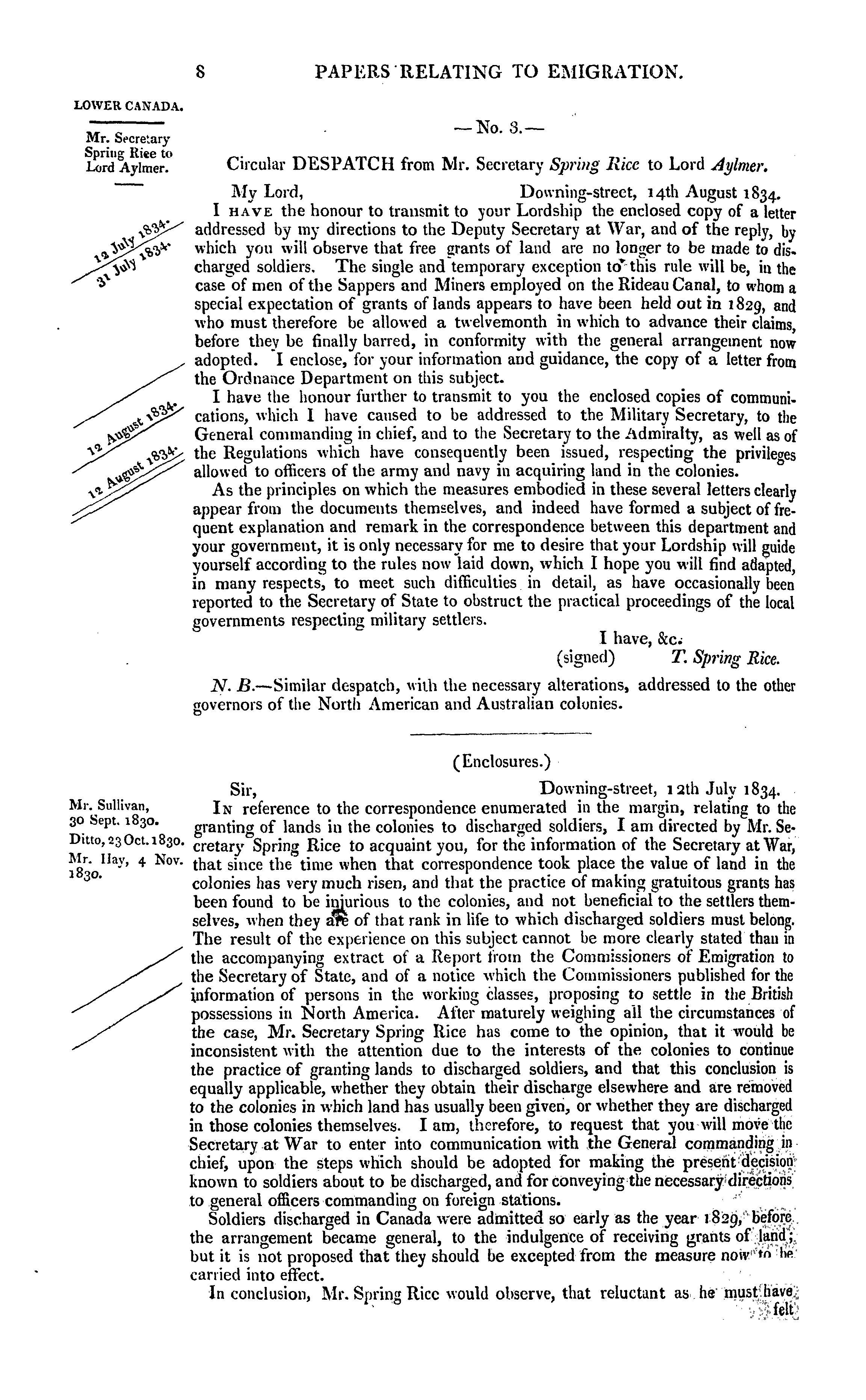 Emigration : return to an address to His Majesty, dated 21 July 1834, for, copies or extracts of any correspondence between the secretary of state and the governors of the British colonies, respecting emigration, and the disposal of Crown lands, not already presented to this House, also, so much of two despatches from Colonel Arthur to Viscount Goderich, dated 9 July 1831, and 28 June 1832, as relates to the consumption of rum in the colony of Van Diemen's Land, and to the difficulties experienced by the masters of assigned servants.