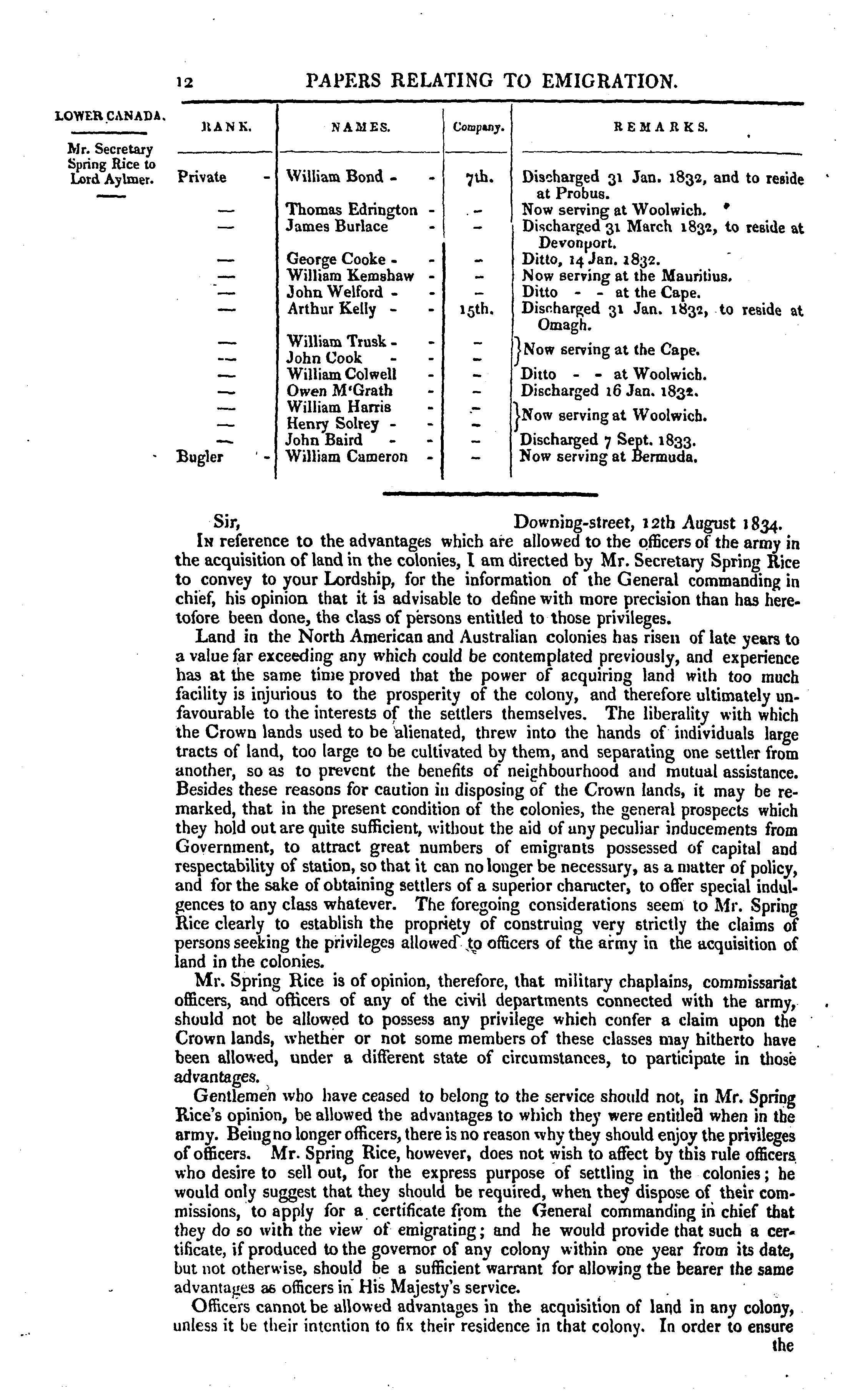 Emigration : return to an address to His Majesty, dated 21 July 1834, for, copies or extracts of any correspondence between the secretary of state and the governors of the British colonies, respecting emigration, and the disposal of Crown lands, not already presented to this House, also, so much of two despatches from Colonel Arthur to Viscount Goderich, dated 9 July 1831, and 28 June 1832, as relates to the consumption of rum in the colony of Van Diemen's Land, and to the difficulties experienced by the masters of assigned servants.