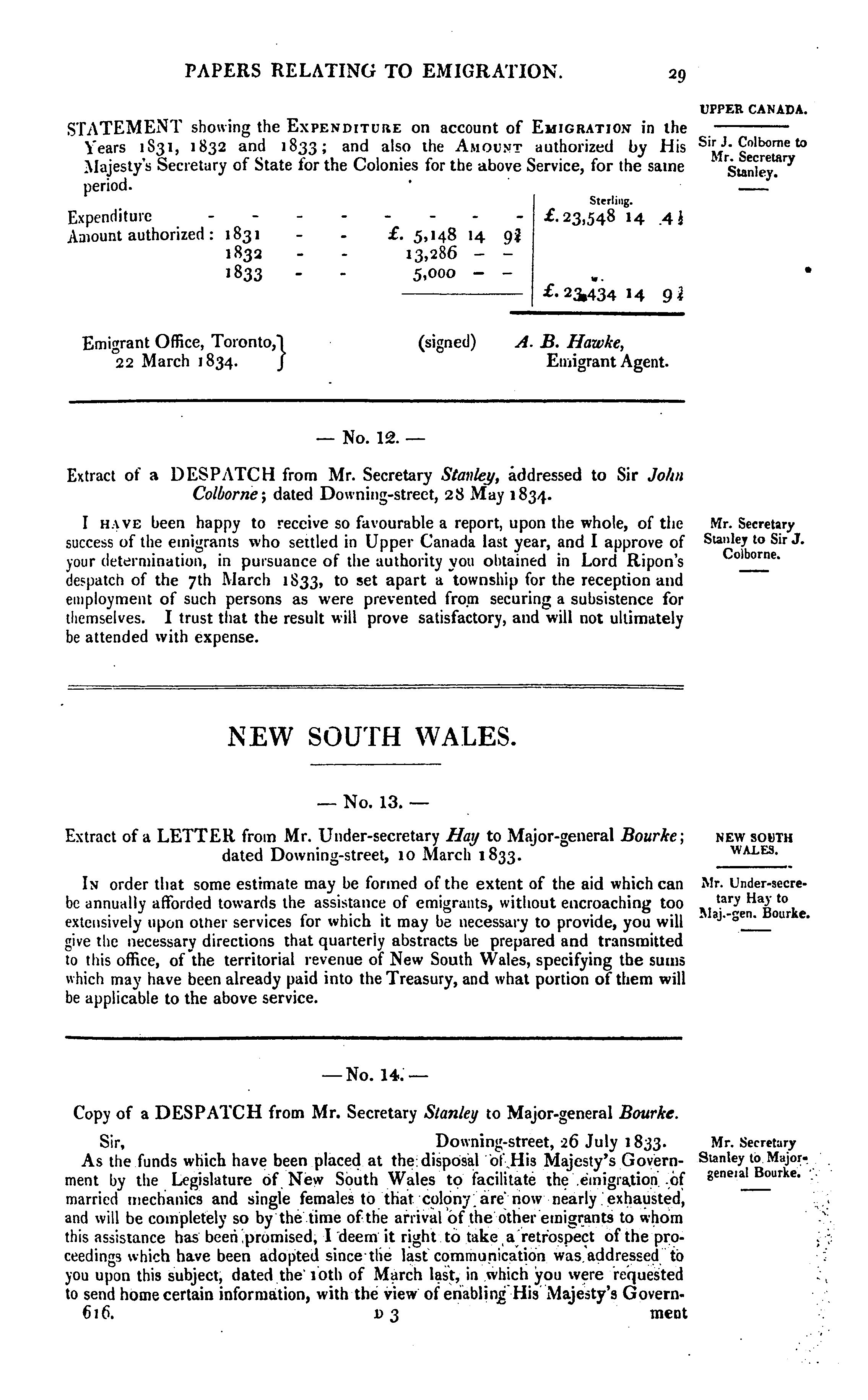 Emigration : return to an address to His Majesty, dated 21 July 1834, for, copies or extracts of any correspondence between the secretary of state and the governors of the British colonies, respecting emigration, and the disposal of Crown lands, not already presented to this House, also, so much of two despatches from Colonel Arthur to Viscount Goderich, dated 9 July 1831, and 28 June 1832, as relates to the consumption of rum in the colony of Van Diemen's Land, and to the difficulties experienced by the masters of assigned servants.