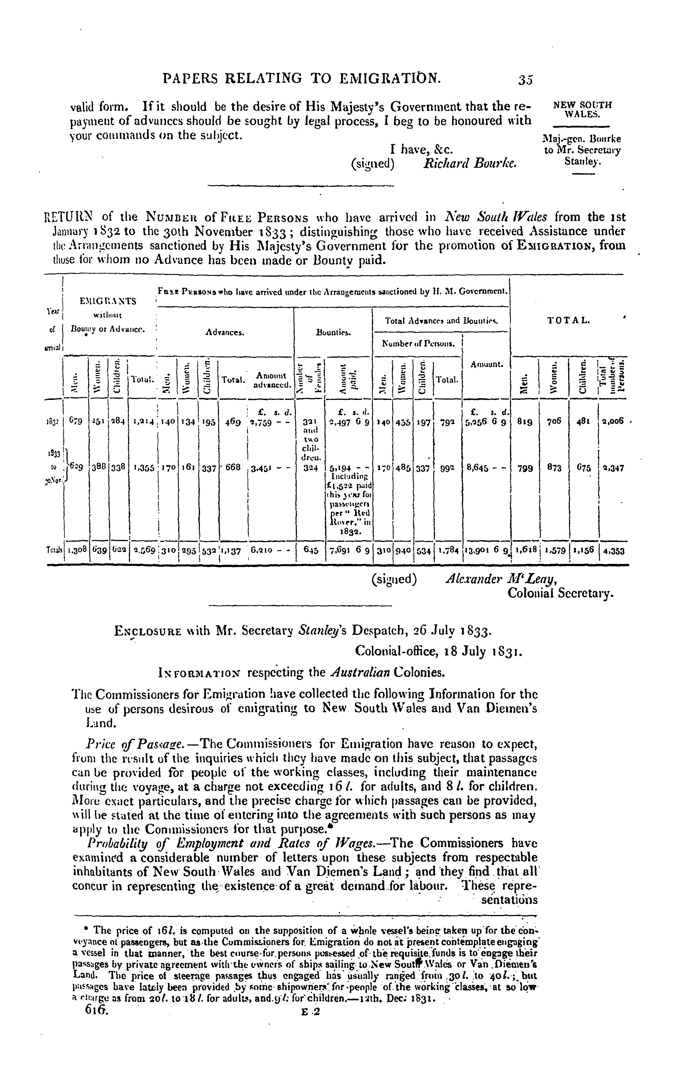 Emigration : return to an address to His Majesty, dated 21 July 1834, for, copies or extracts of any correspondence between the secretary of state and the governors of the British colonies, respecting emigration, and the disposal of Crown lands, not already presented to this House, also, so much of two despatches from Colonel Arthur to Viscount Goderich, dated 9 July 1831, and 28 June 1832, as relates to the consumption of rum in the colony of Van Diemen's Land, and to the difficulties experienced by the masters of assigned servants.