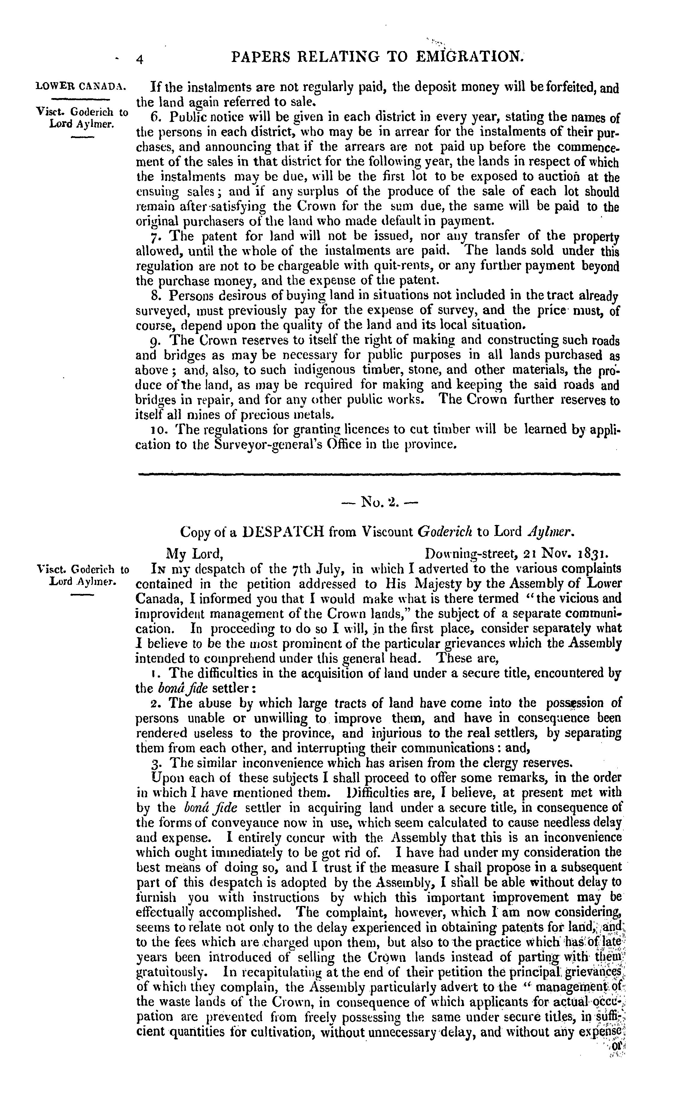 Return to an address to His Majesty, dated 21 July 1834, for, copies or extracts of any correspondence between the secretary of state and the governors of the British colonies, respecting emigration, and the disposal of Crown lands, not already presented to this House, also, so much of two despatches from Colonel Arthur to Viscount Goderich, dated 9 July 1831, and 28 June 1832, as relates to the consumption of rum in the colony of Van Diemen's Land, and to the difficulties experienced by the masters of assigned servants
